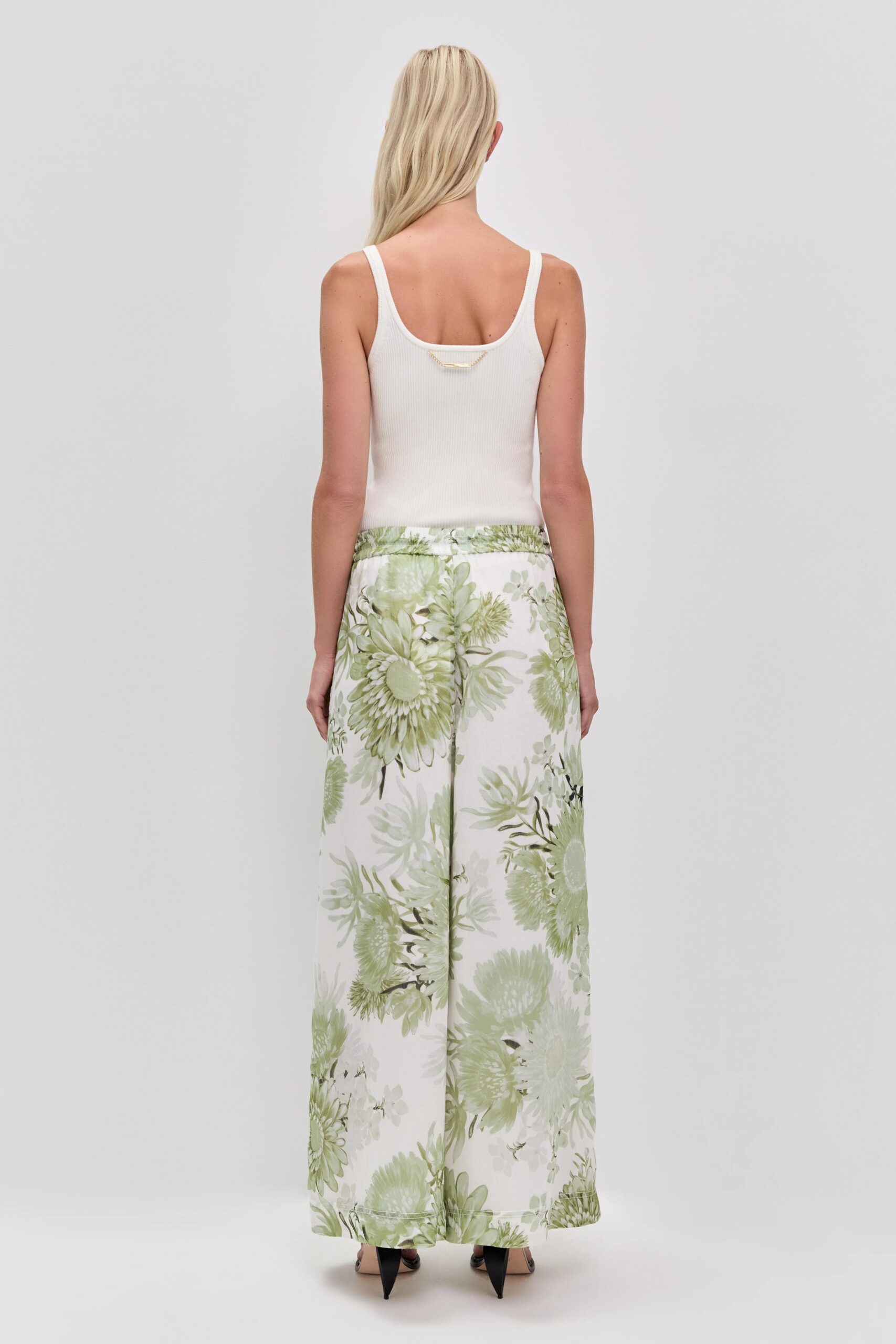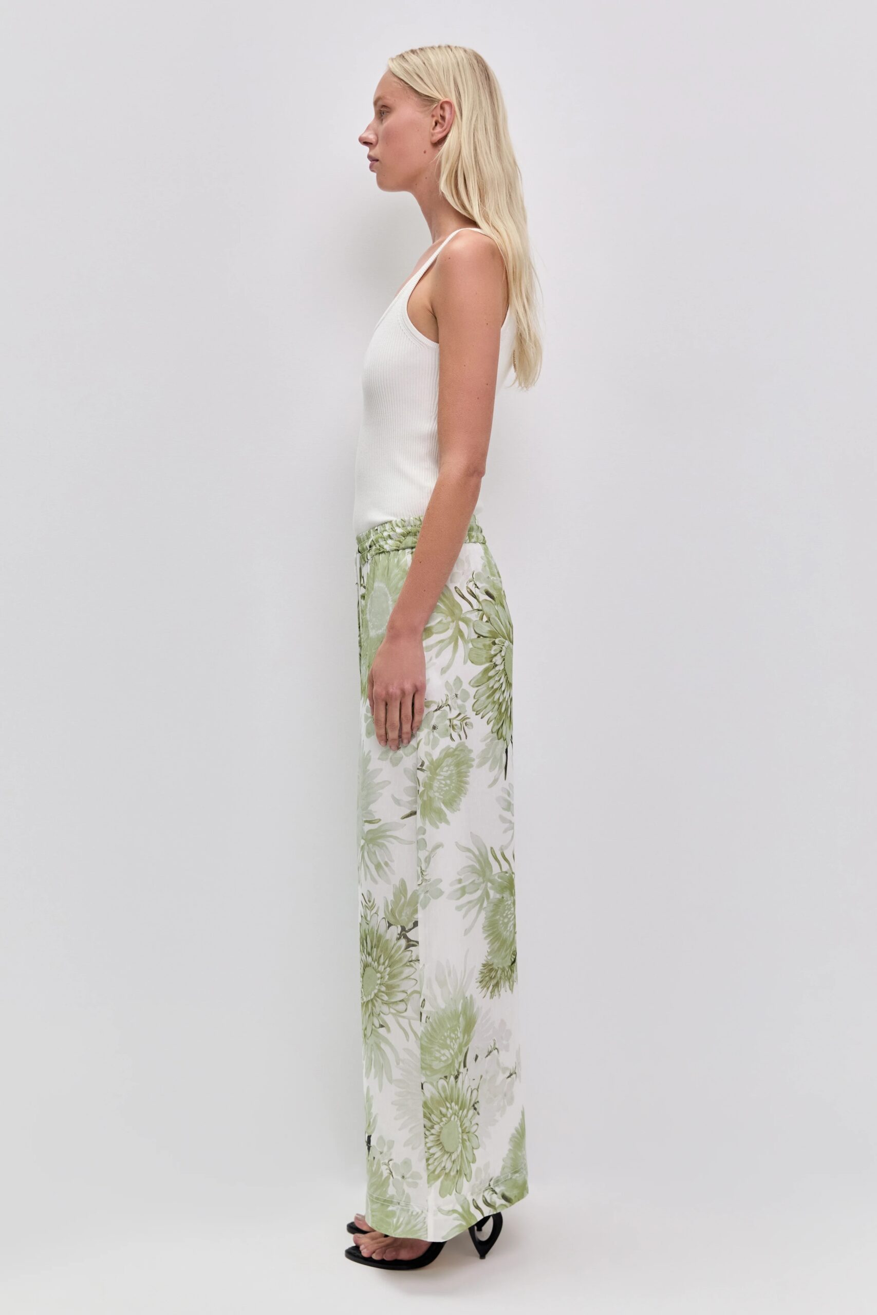 The Adina Pant is a relaxed, high-waisted style designed for effortless wear. Cut in a fluid wide-leg silhouette, it features a soft green floral print for a fresh, elevated feel. Finished with a stretch waistband and gold tie ends, it offers both comfort and refined detail.