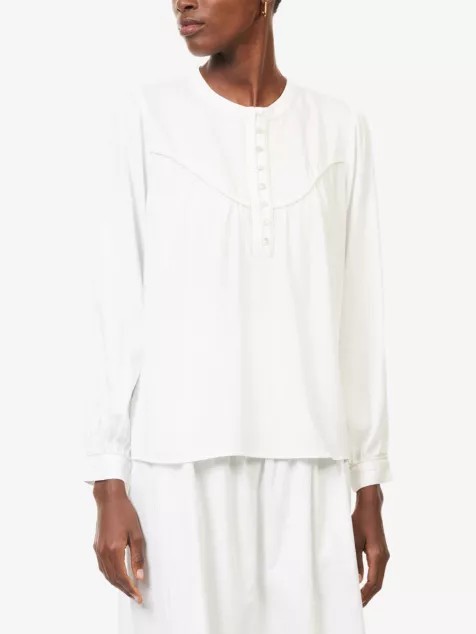 The high neckline and softly defined waist create a flattering shape, while decorative buttons and scalloped shoulder trim add a charming, feminine touch.