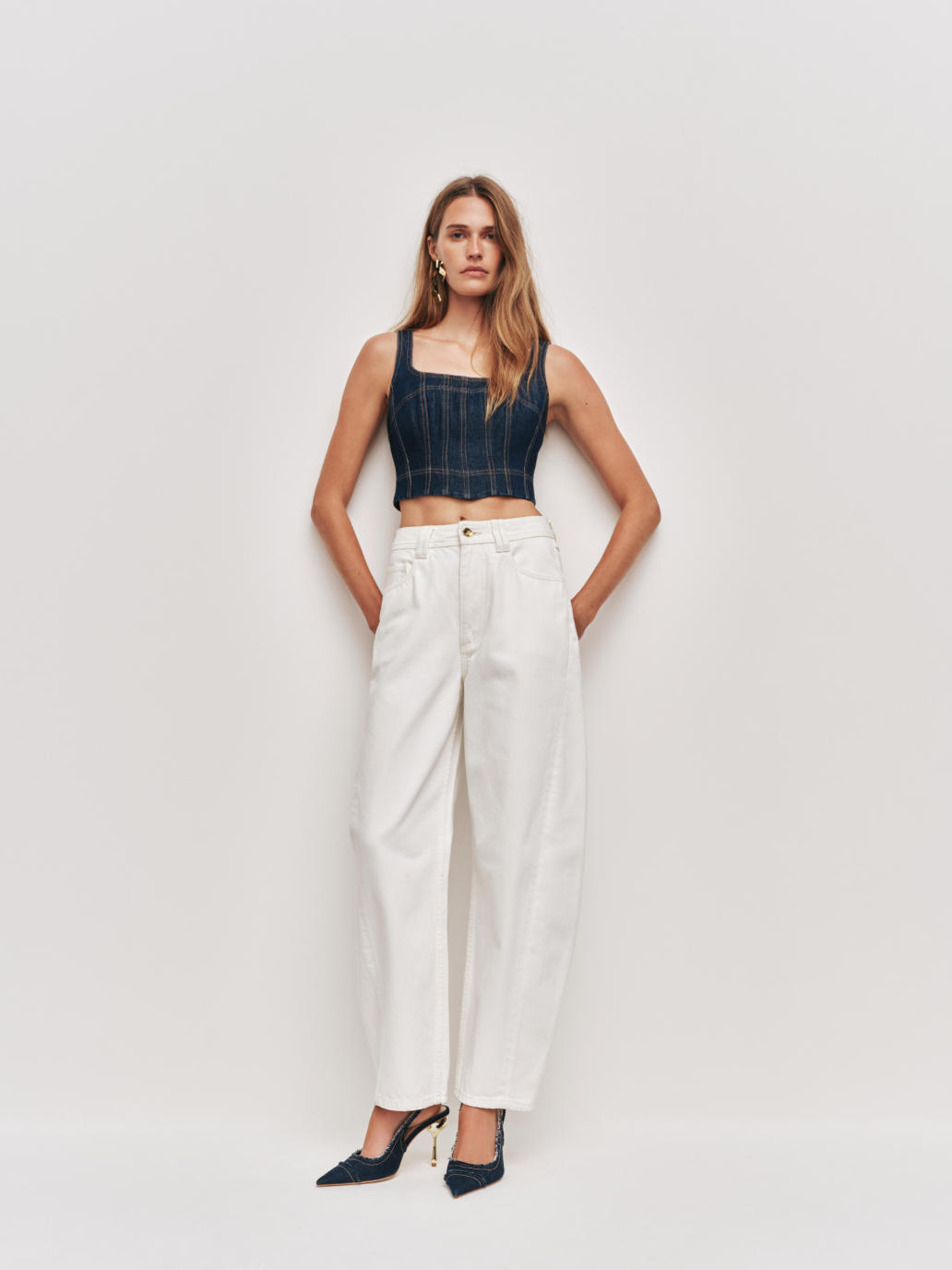 Add a modern twist to your wardrobe with this women’s denim top. Featuring panel seam detailing and a soft square neckline, it combines structure with subtle femininity. Refined topstitching enhances the design, while an external back zip with a sculptural puller adds a contemporary, statement-making touch.