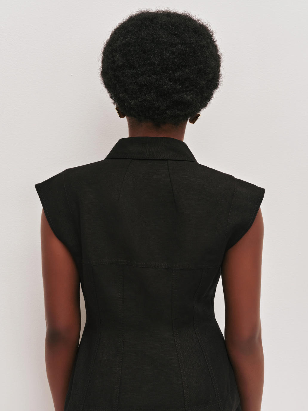Elevate your everyday wardrobe with this chic women’s sleeveless top. Featuring a classic shirt collar with a statement button at the front neck, it blends tailored elegance with effortless style. Panel seam detailing and refined topstitching add subtle structure, while the concealed front button placket keeps the look sleek and polished.