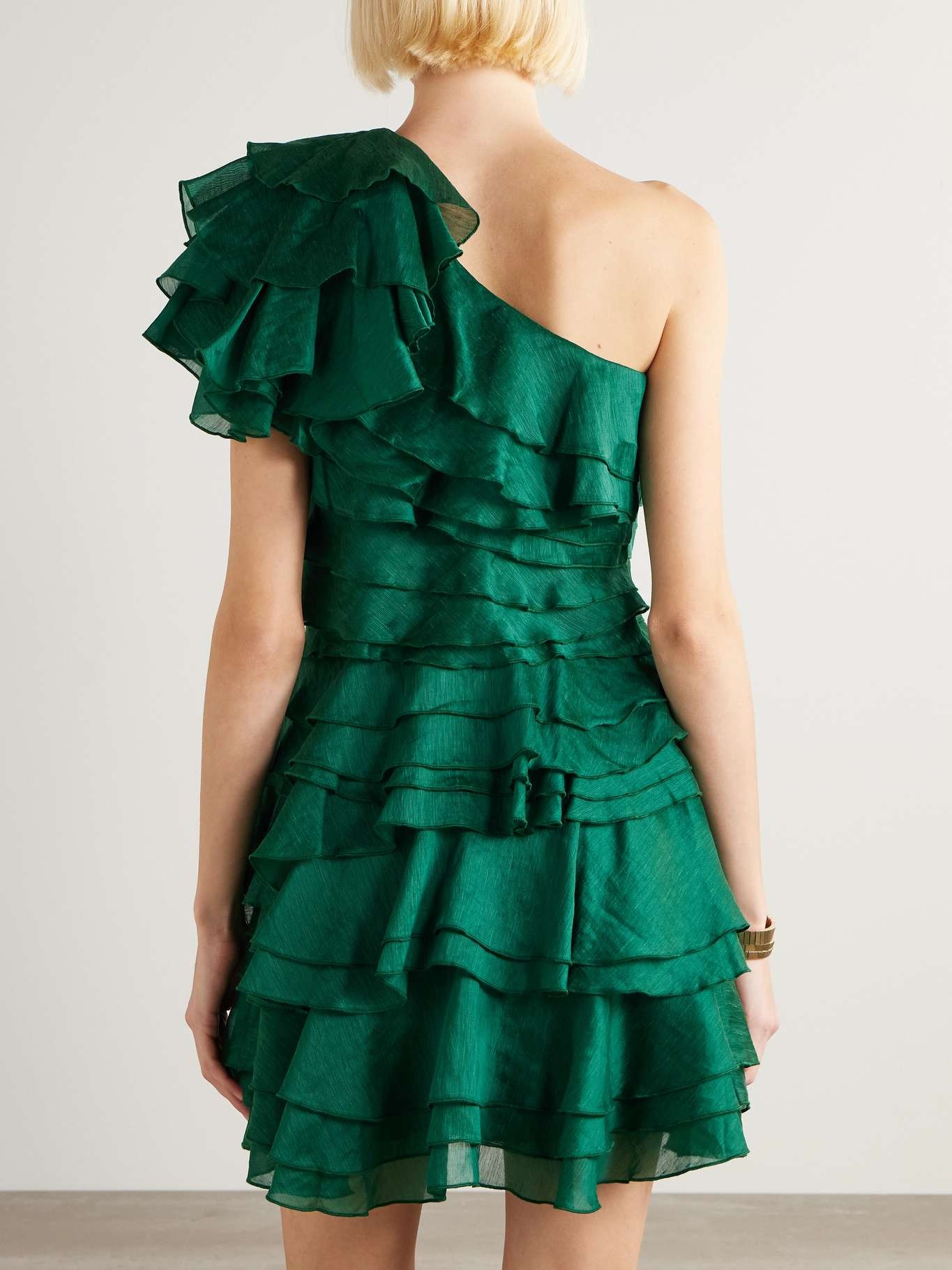 Turn heads in this playful one-shoulder mini dress, featuring layered frills throughout for movement and dimension. The fitted bodice enhances your silhouette, while the asymmetrical neckline adds a modern, chic touch—perfect for special occasions or evening events.