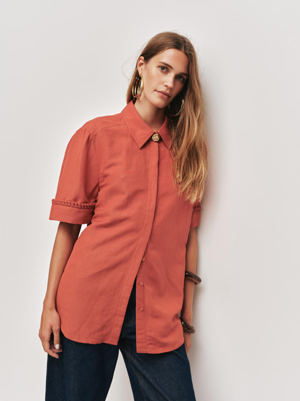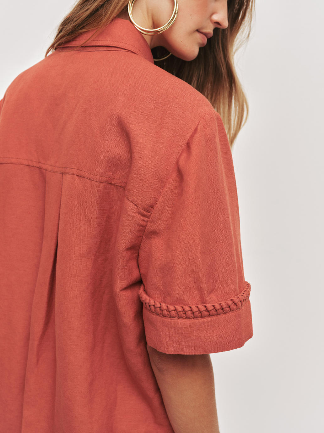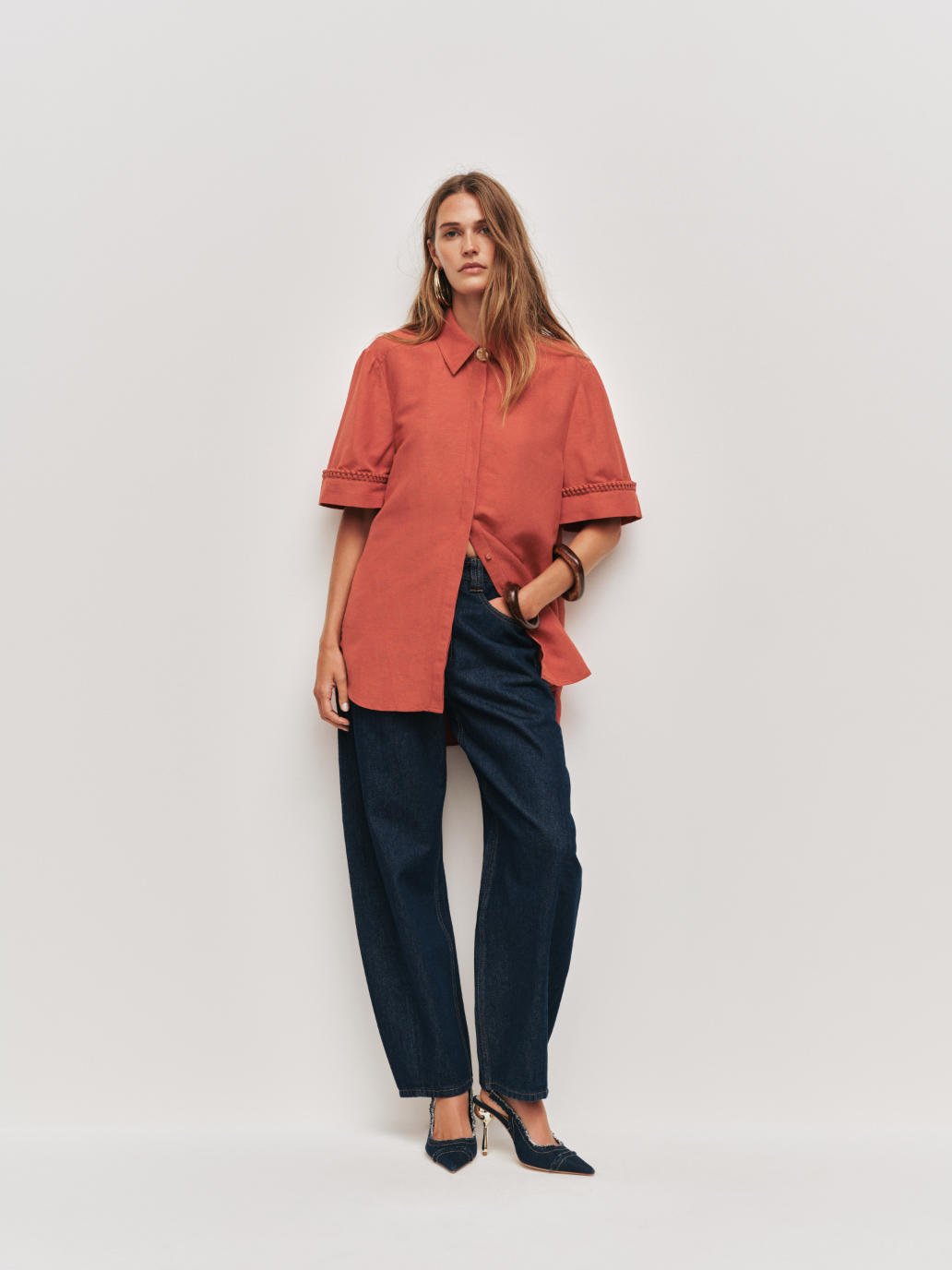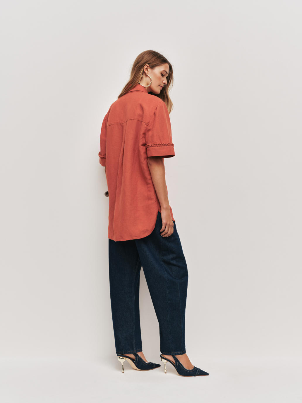 Cut with an effortless drape, the Tropez short sleeve shirt balances ease and polish, making it the perfect counterpart to the matching wide-leg trousers. Clean lines and a fluid silhouette allow the fabric to move naturally, offering an elevated approach to warm-weather dressing that transitions seamlessly from day to evening.