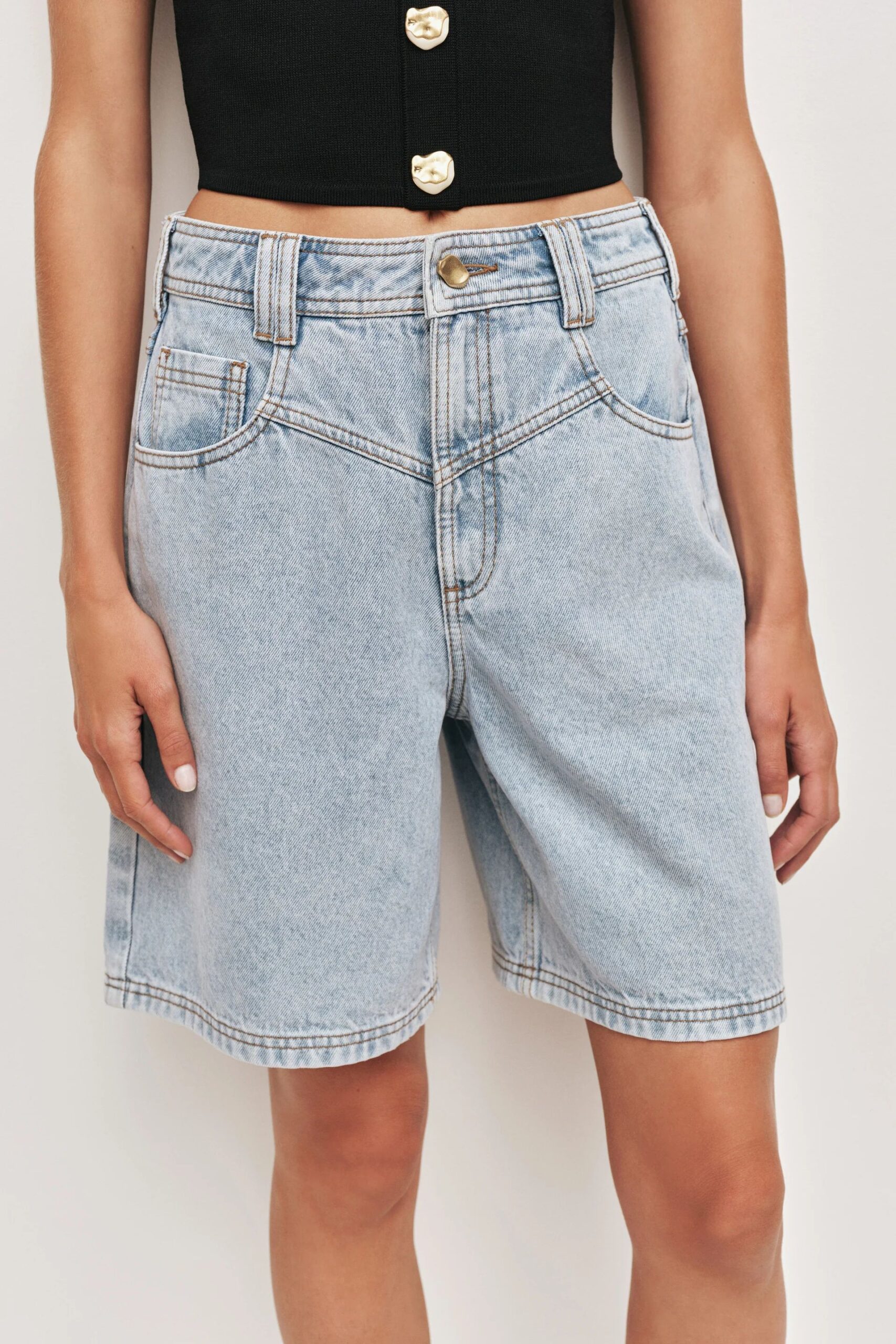 The Amie Denim Short in Light Wash Blue offers a fresh, modern take on classic denim, as seen on the Resort ’26 runway.