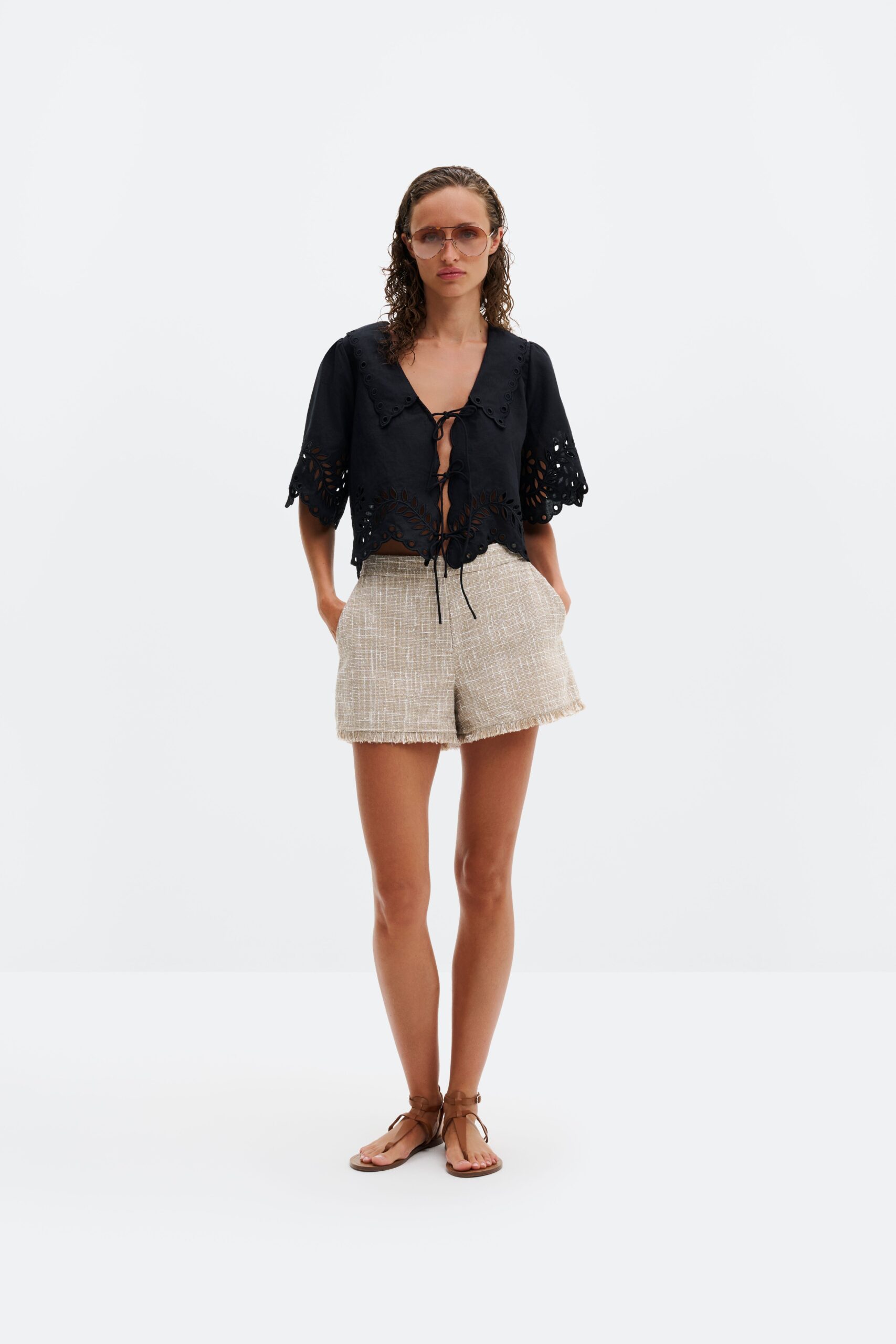 Flutter sleeves and a gently flared hem add movement and feminine sophistication, making it perfect for pairing with tailored trousers or denim.