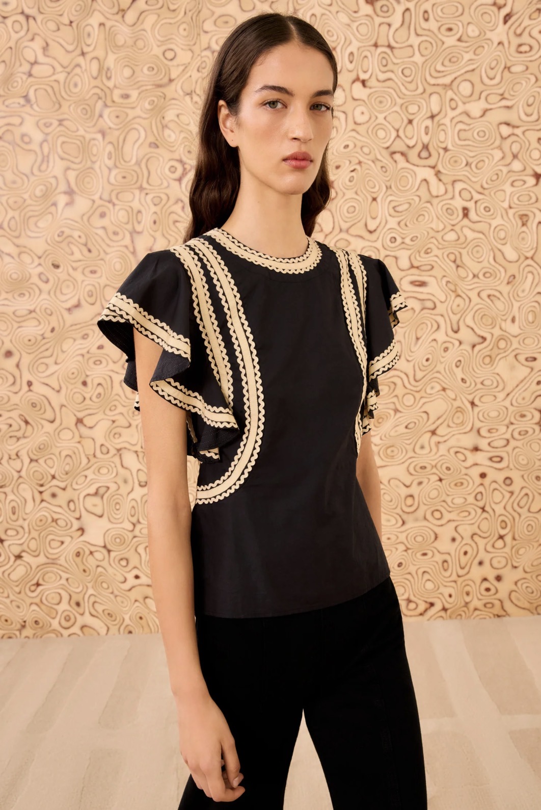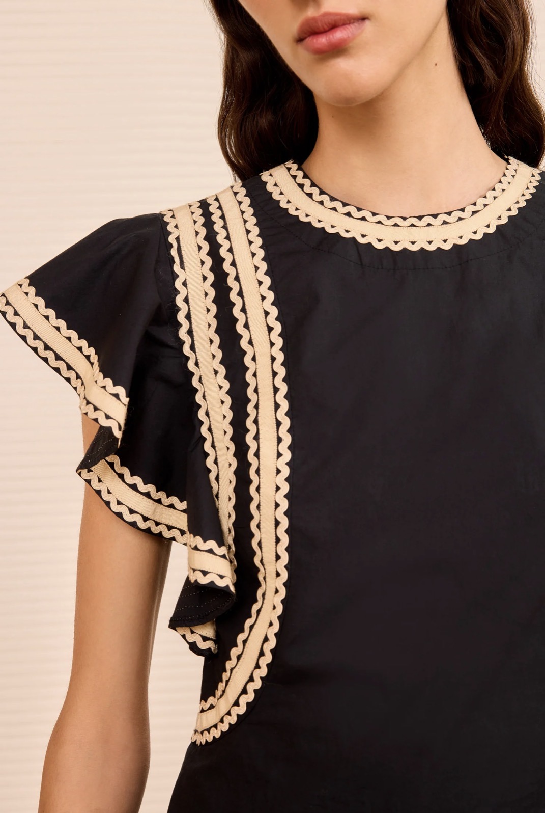 The Anora Top in Noir is crafted from soft water-washed poplin and detailed with ric-rac and grosgrain ribbons, creating a graphic, elevated aesthetic.