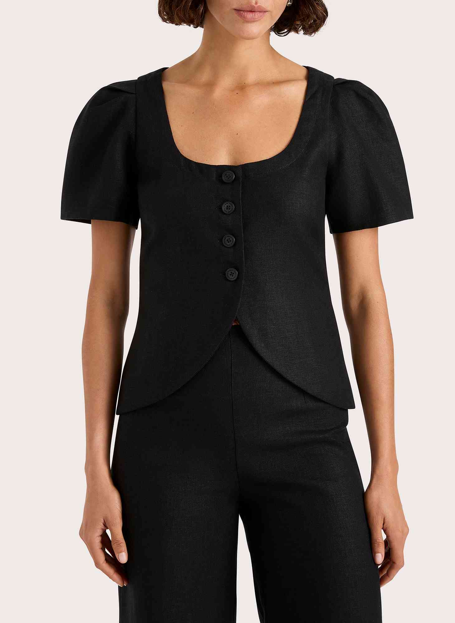 Designed with a soft scoop neckline and matching button-front closure, it features oversized cap sleeves with subtle gathering for a modern, sculptural feel.