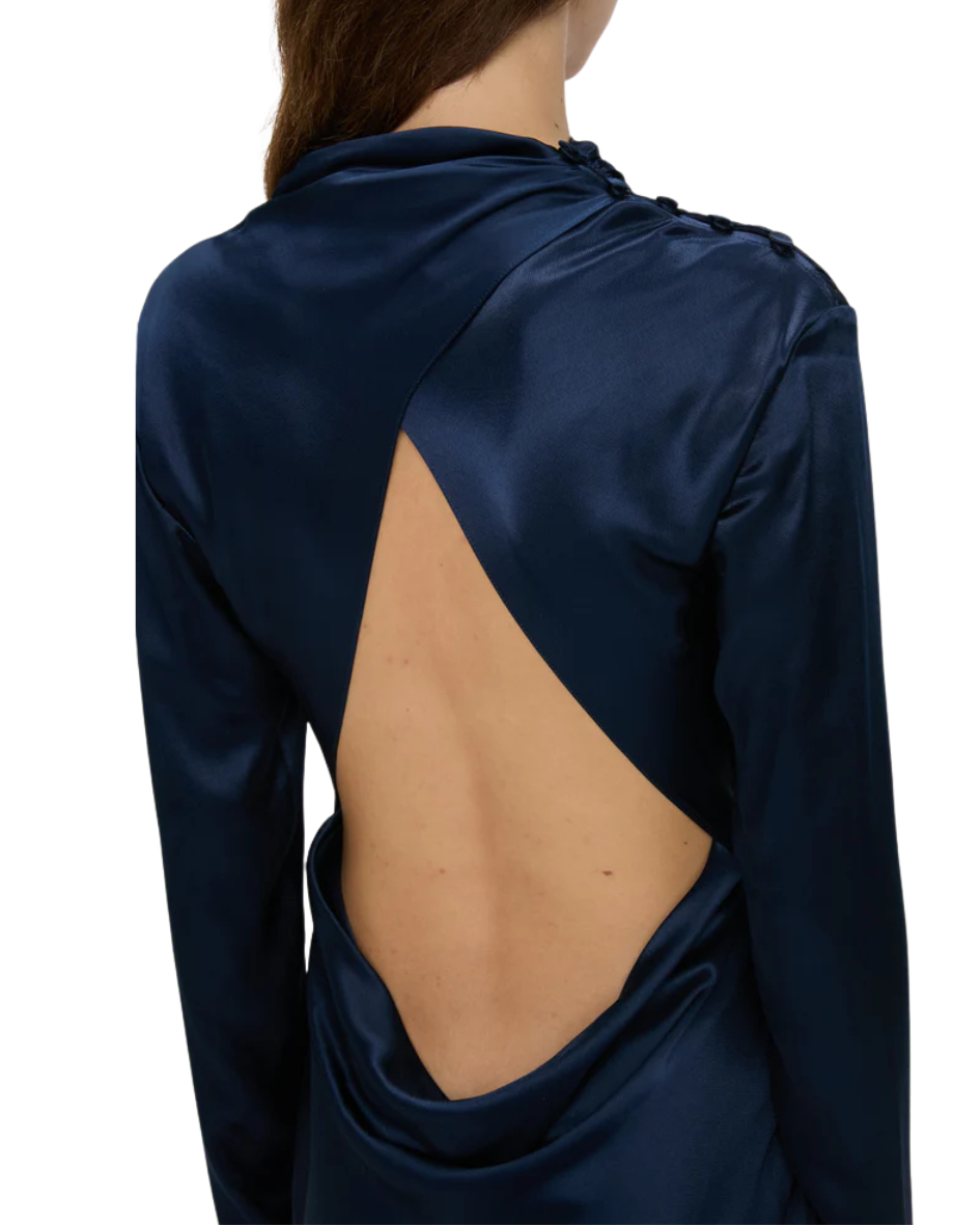 Cut from soft satin with a subtle sheen, this bias-cut midi falls effortlessly over the figure, revealing an open back and a softly draped cowl skirt.