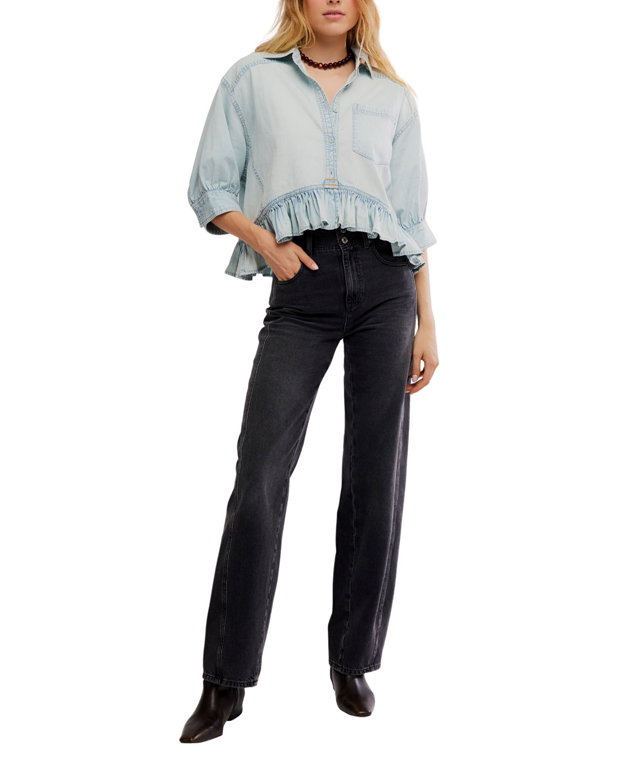 Finished with soft balloon sleeves and a ruffled hem, it offers a relaxed silhouette that feels equal parts casual and elevated. Wear yours buttoned up or layered over a tank.