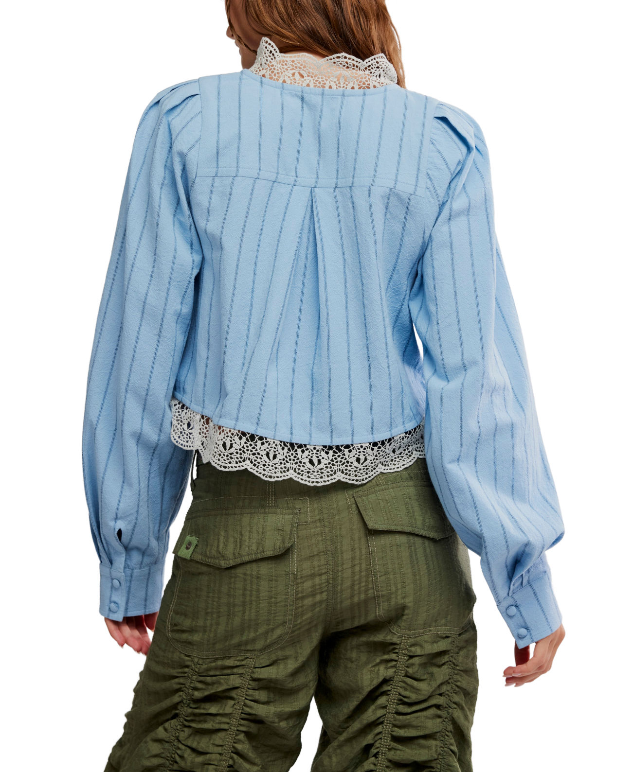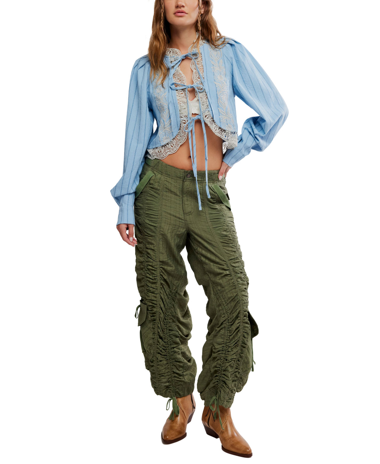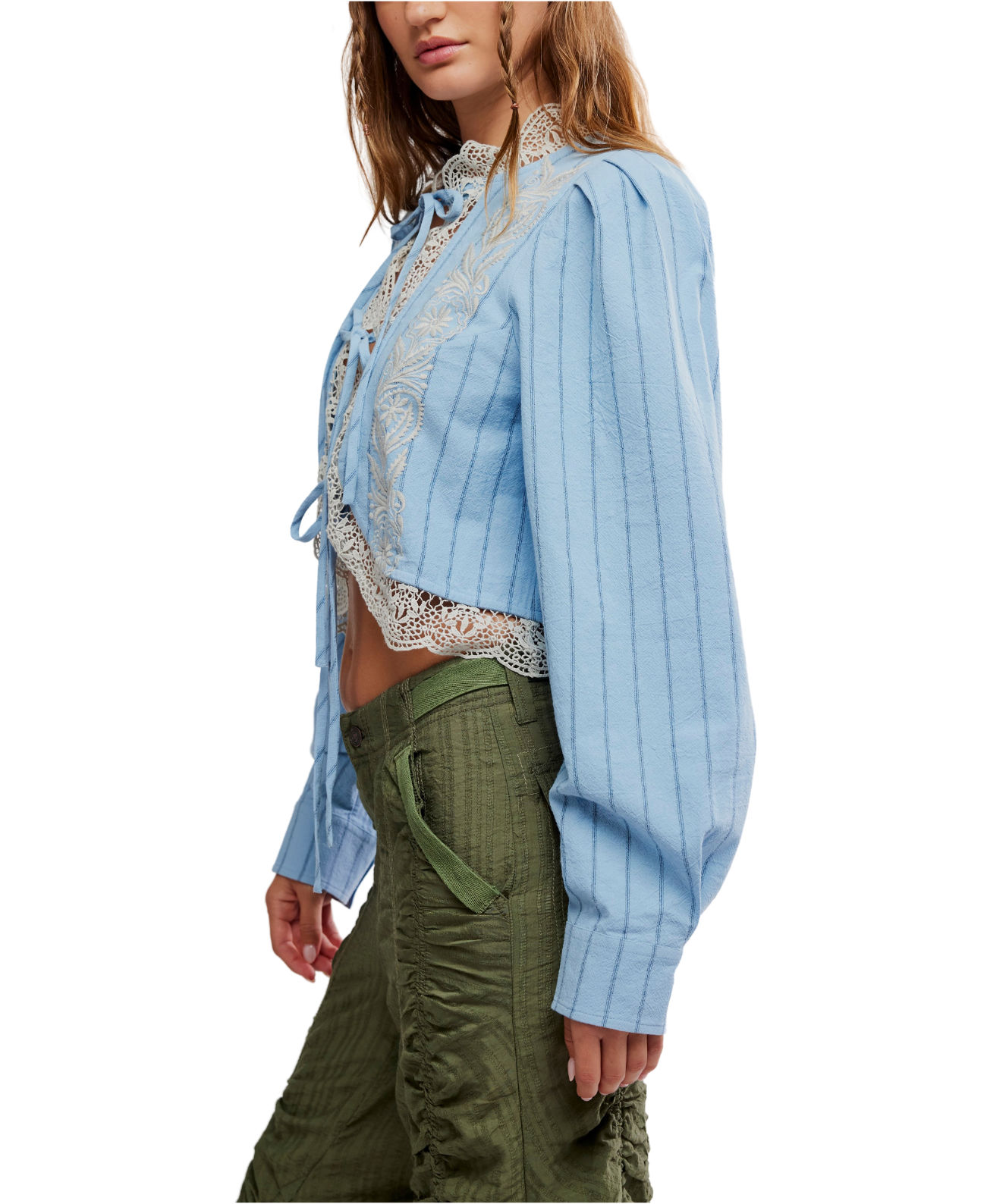 Featuring lace panels, balloon sleeves, and a gentle tie front, it’s designed to add romance to everyday denim and effortless elegance to warm-weather styling.