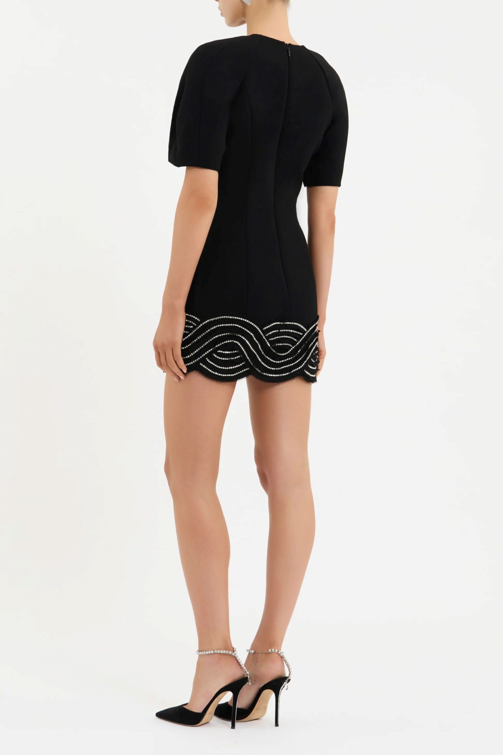 The Bellatrix Short Sleeve Mini Dress in black combines modest glamour with sparkling detail.