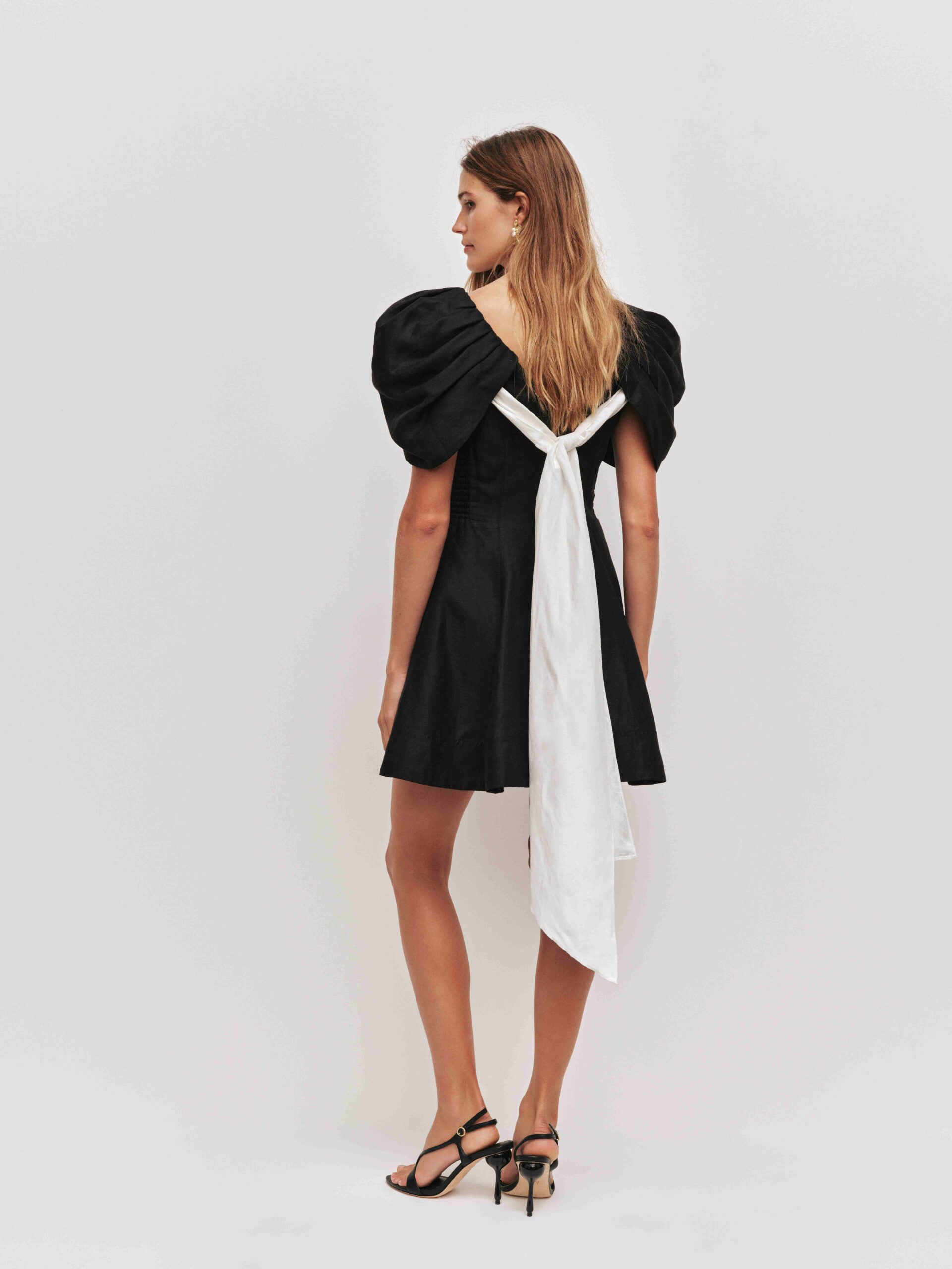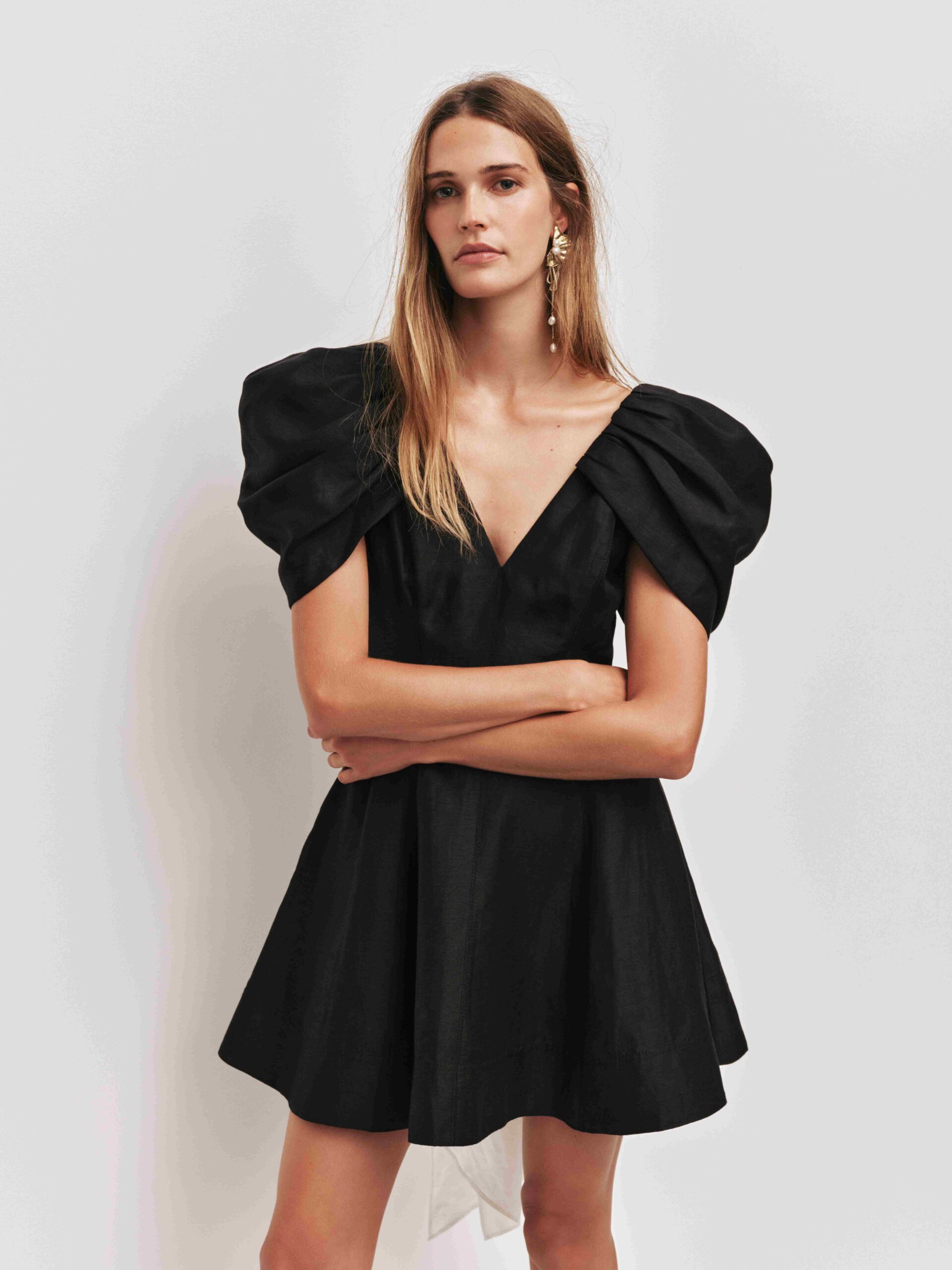 • V-neckline with sculptural puff sleeves featuring tucks