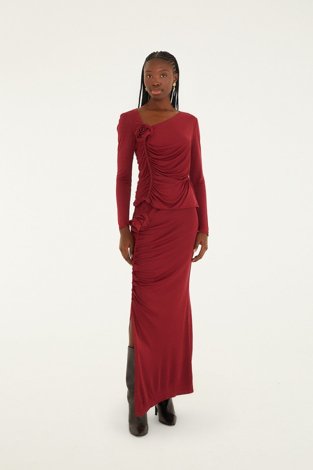 A rich burgundy blouse designed with an asymmetrical neckline and sculptural draping.
