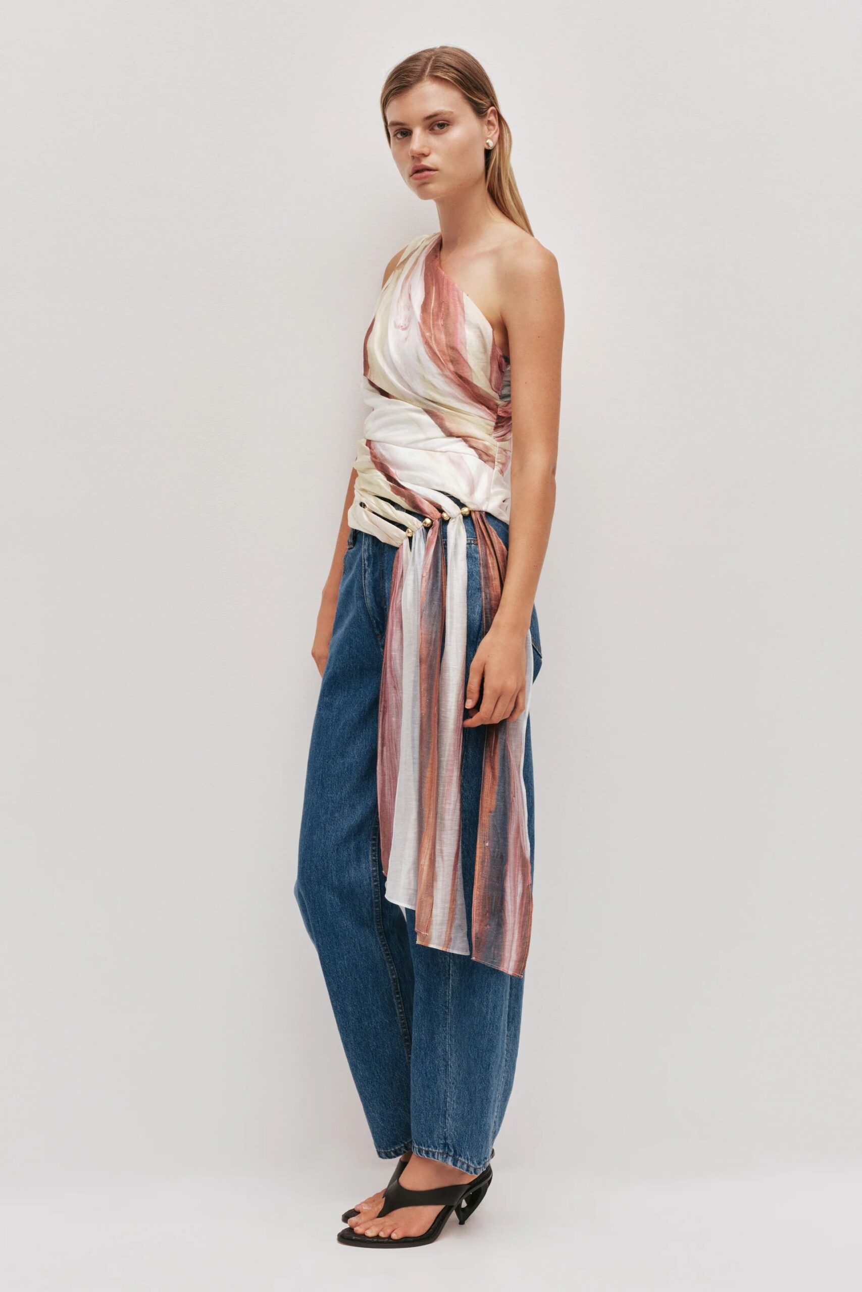 The Capture One Shoulder Top is a contemporary statement piece, designed with a sleek fitted silhouette and striking asymmetric detailing.