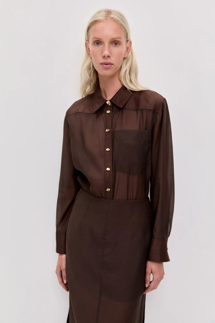 A modern wardrobe essential, the Capture shirt in chocolate offers refined tailoring with a rich, earthy tone. Its clean lines and versatile design create a timeless, elevated staple. Shirt collar with accent button, Straight sleeves with exaggerated cuffs, Contrast trims, Side splits at hem, Unlined style