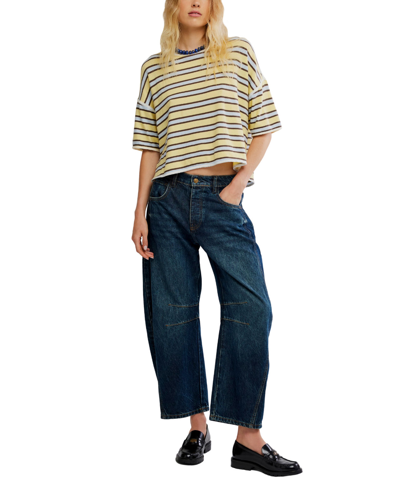 Finished with bold stripes, extra-wide sleeves, and contrast trim, this cropped style is ideal with high-rise denim or lounge-ready bottoms.