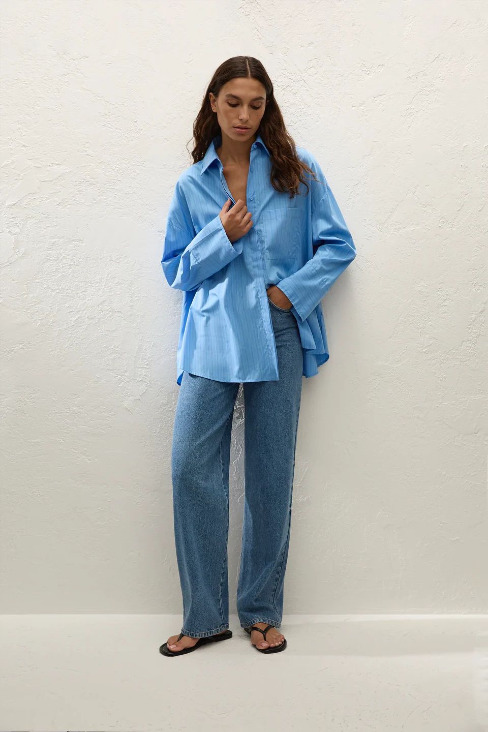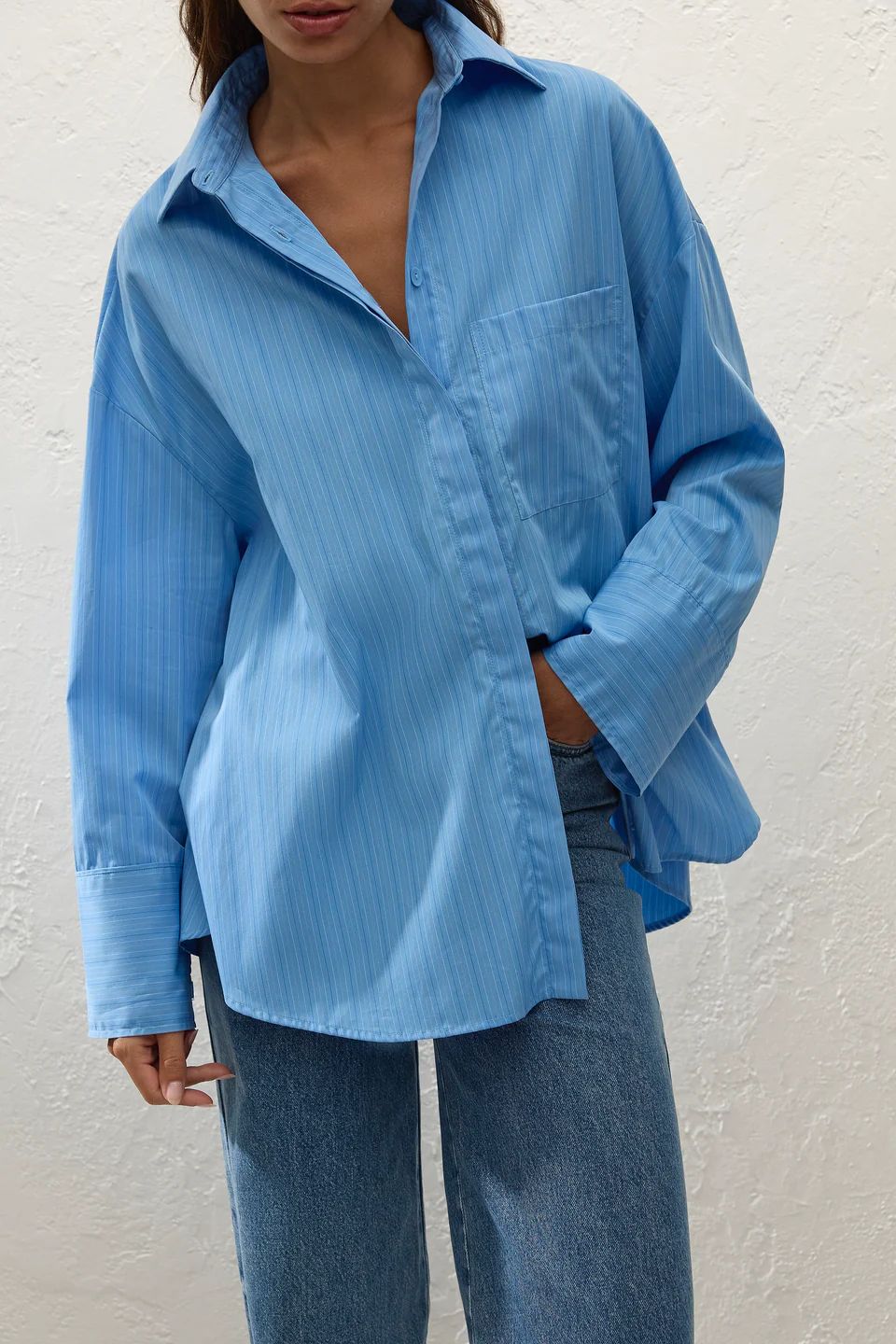 This oversized boyfriend-style shirt is designed for effortless, coastal-inspired dressing.