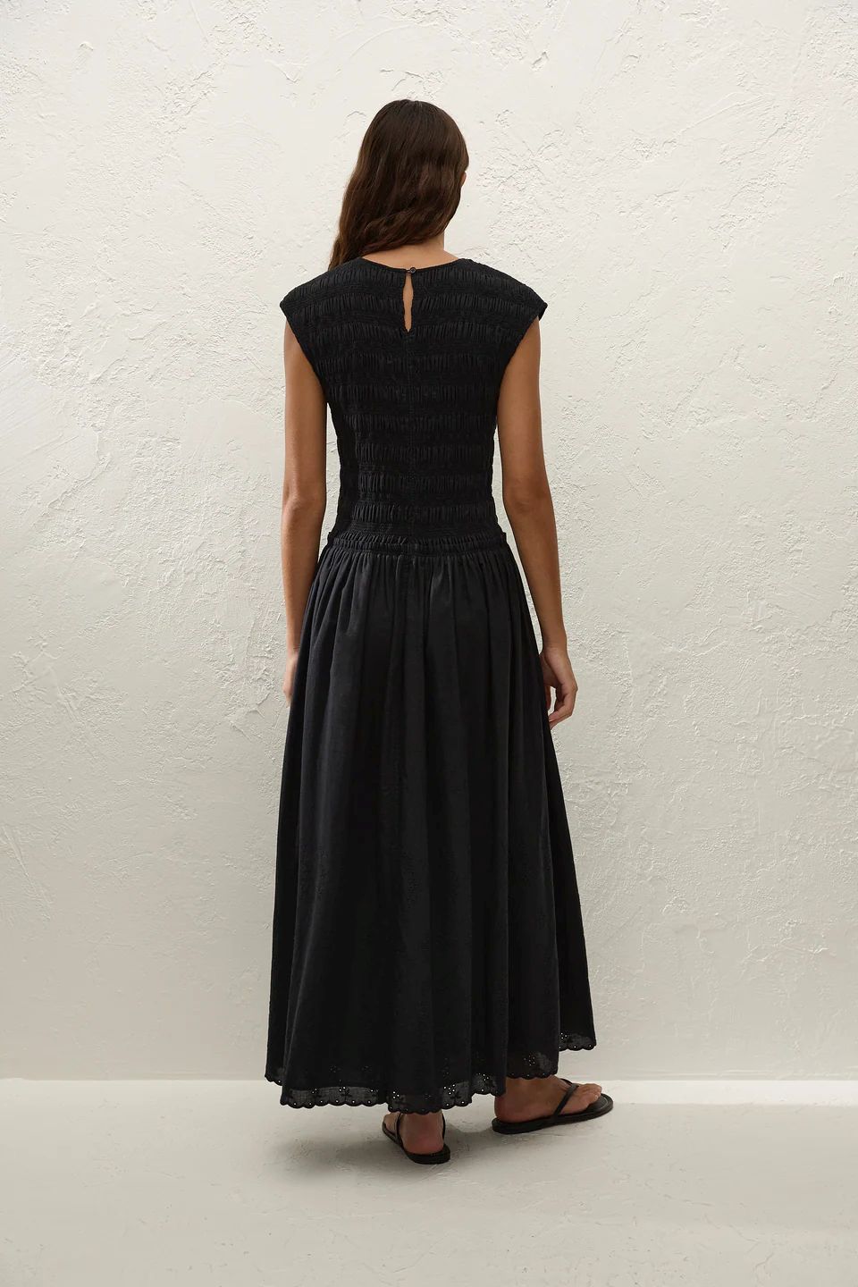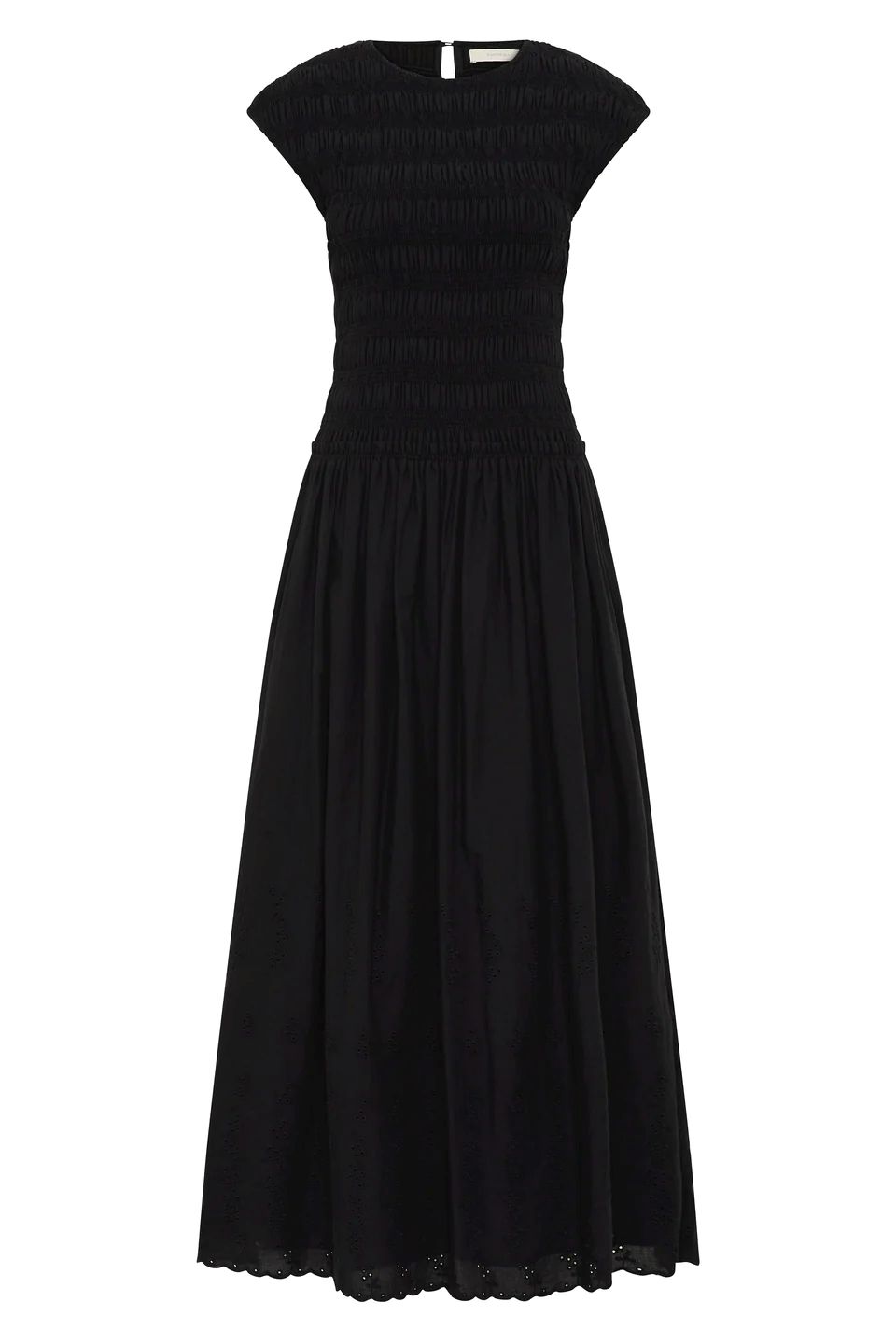 Crafted from delicate anglaise broderie in crisp white, it features a high rounded neckline, shirred bodice, and short cap sleeves for a flattering fit.