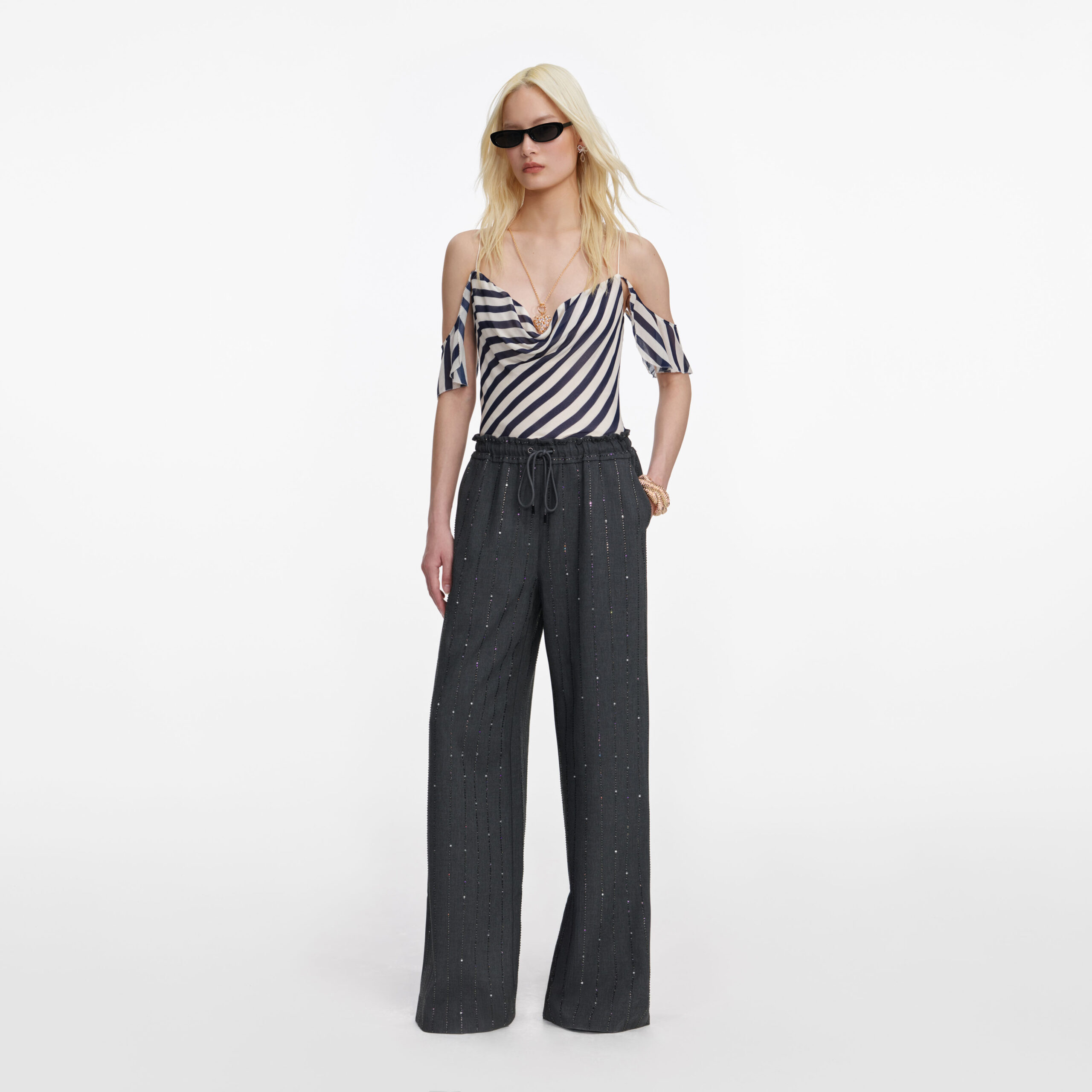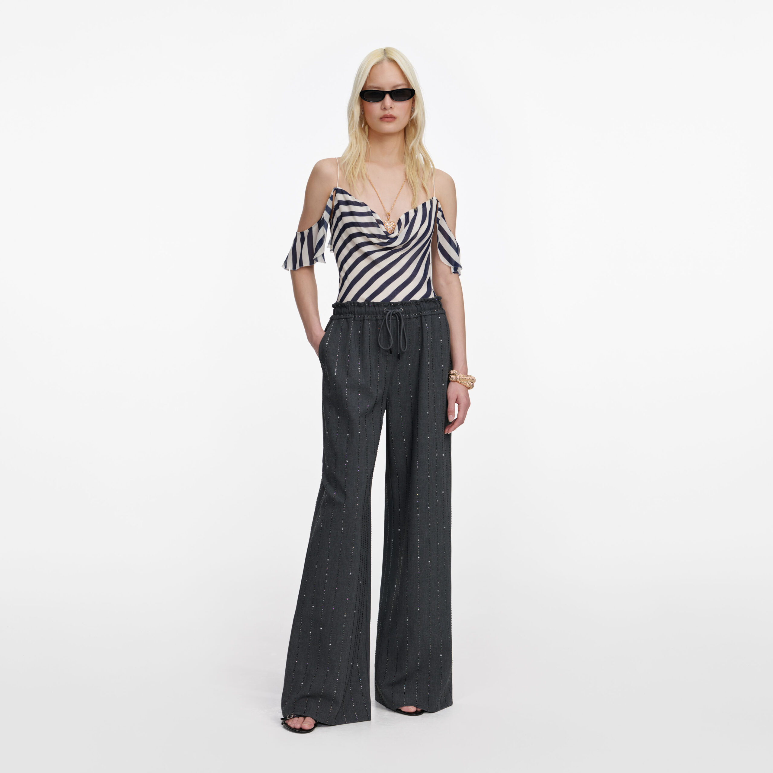 A fresh take on occasion-ready tailoring, these wide-leg trousers are elevated with subtle rhinestone pinstripes that catch the light beautifully.