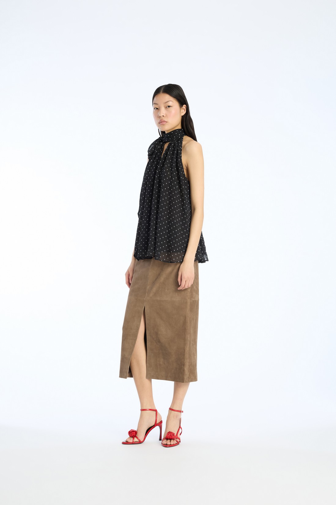 Crafted from delicate dotted chiffon, it features a high neckline with an elegant side bow tie and a soft, flowing silhouette.