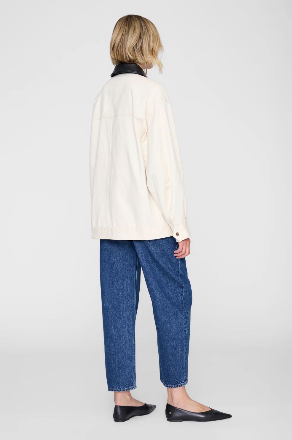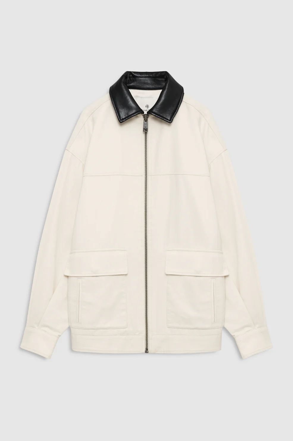 Crafted from smooth, structured cotton, it features a contrasting black point collar, front zip closure, and oversized patch pockets.
