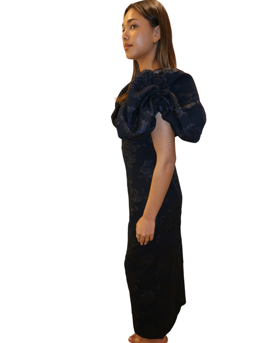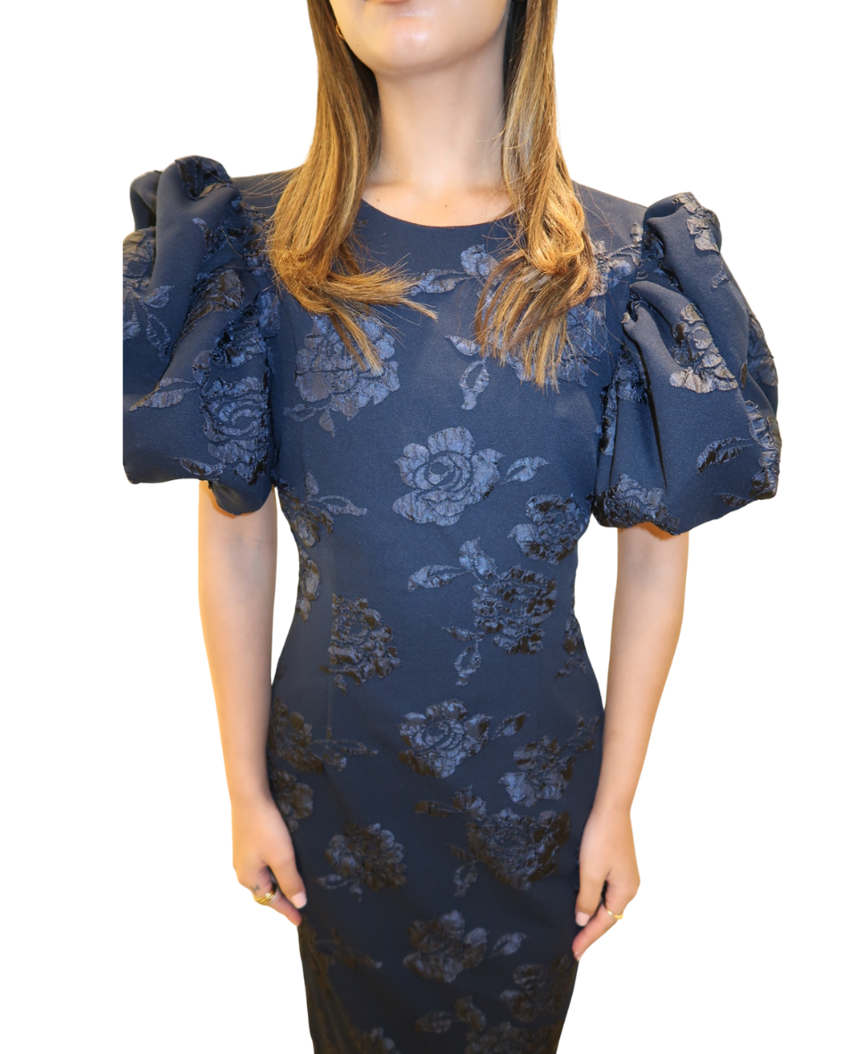 Crafted from floral jacquard fabric, it features short voluminous puff sleeves and a fitted bodice that flows into a straight midi-length skirt.