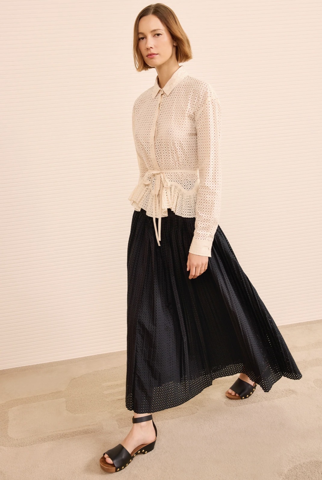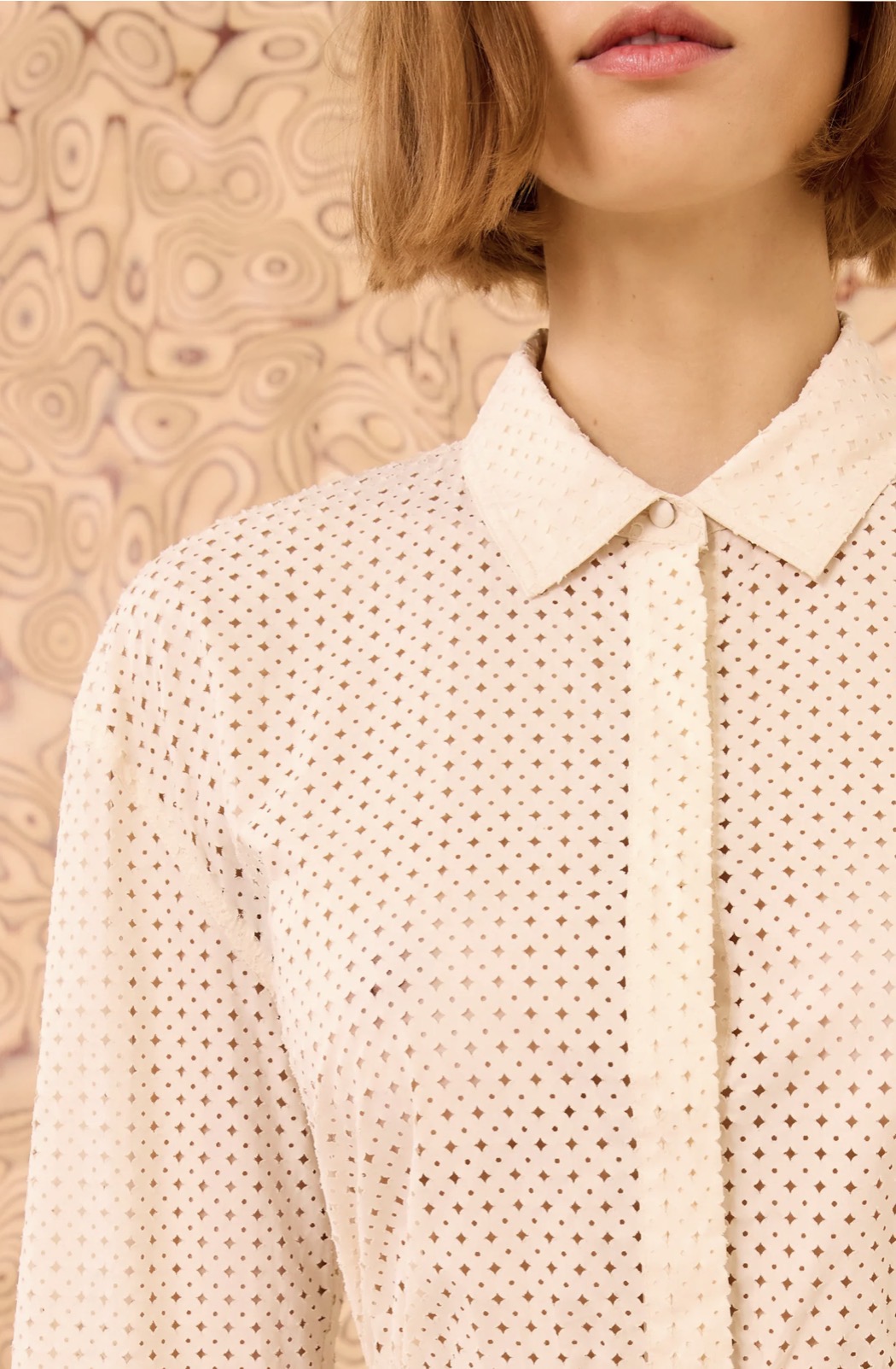Defined by graphic elegance, the Kellia Blouse in Cowrie is crafted from signature perforated cotton poplin.