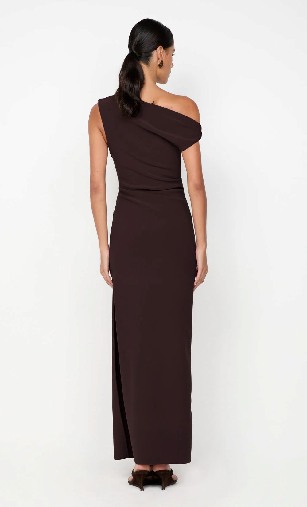The BEC + BRIDGE Leora Asymmetric Maxi Dress in Dark Chocolate is a refined take on modern evening dressing.