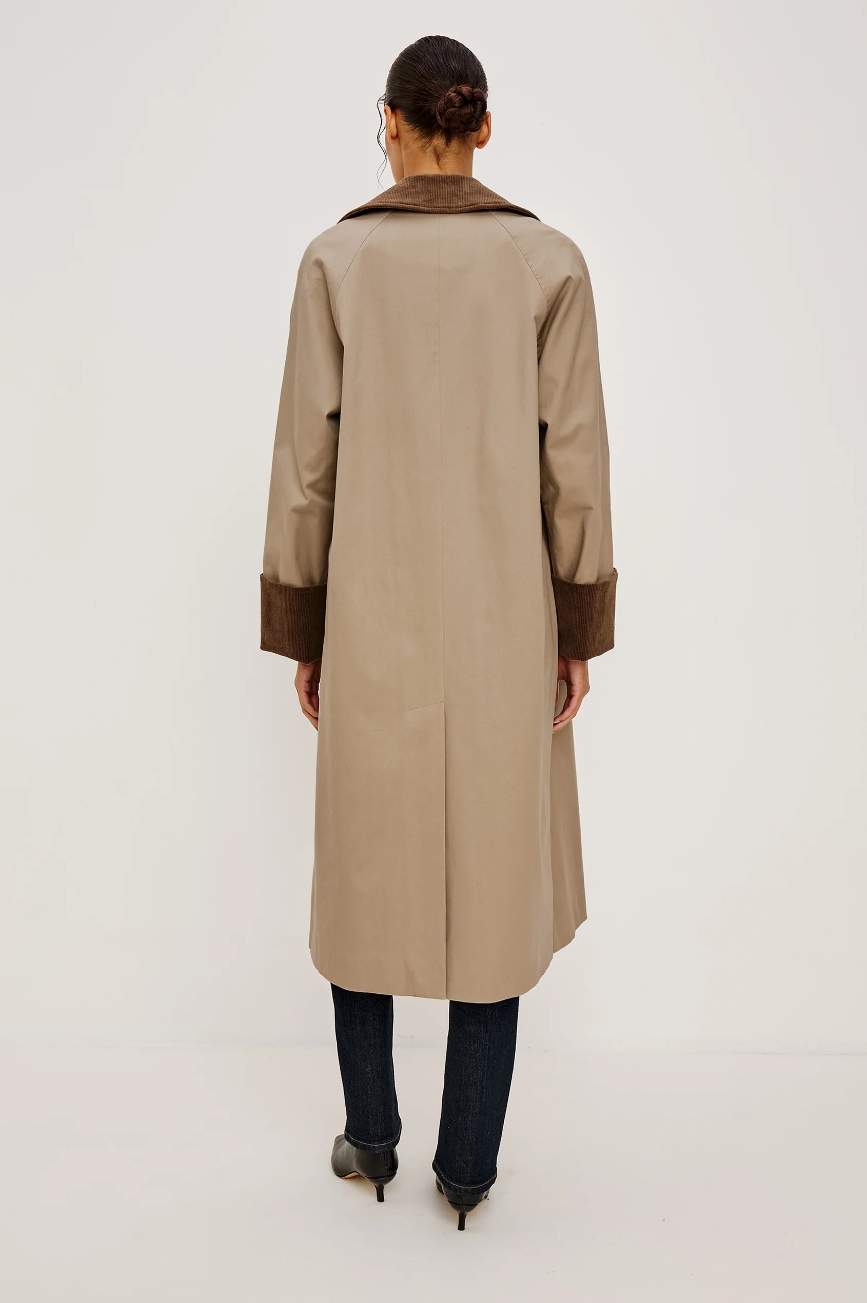 • Features contrast corduroy collar, rolled cuffs, hidden placket, side pockets, plaid lining, back vent sli