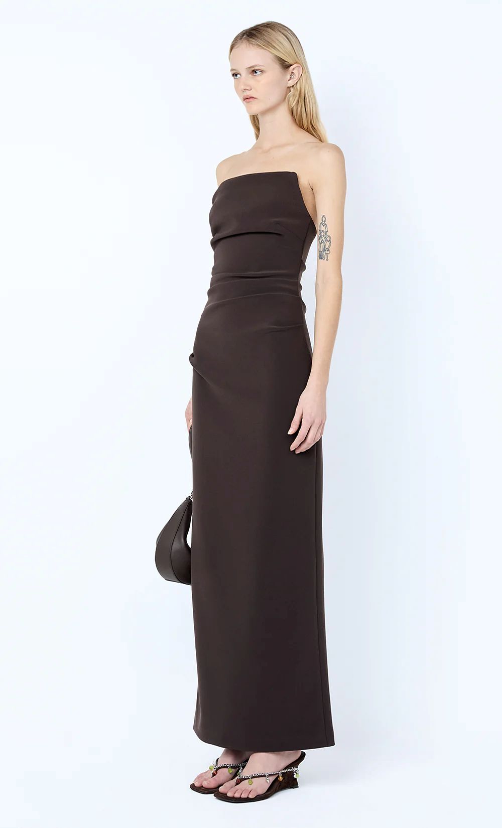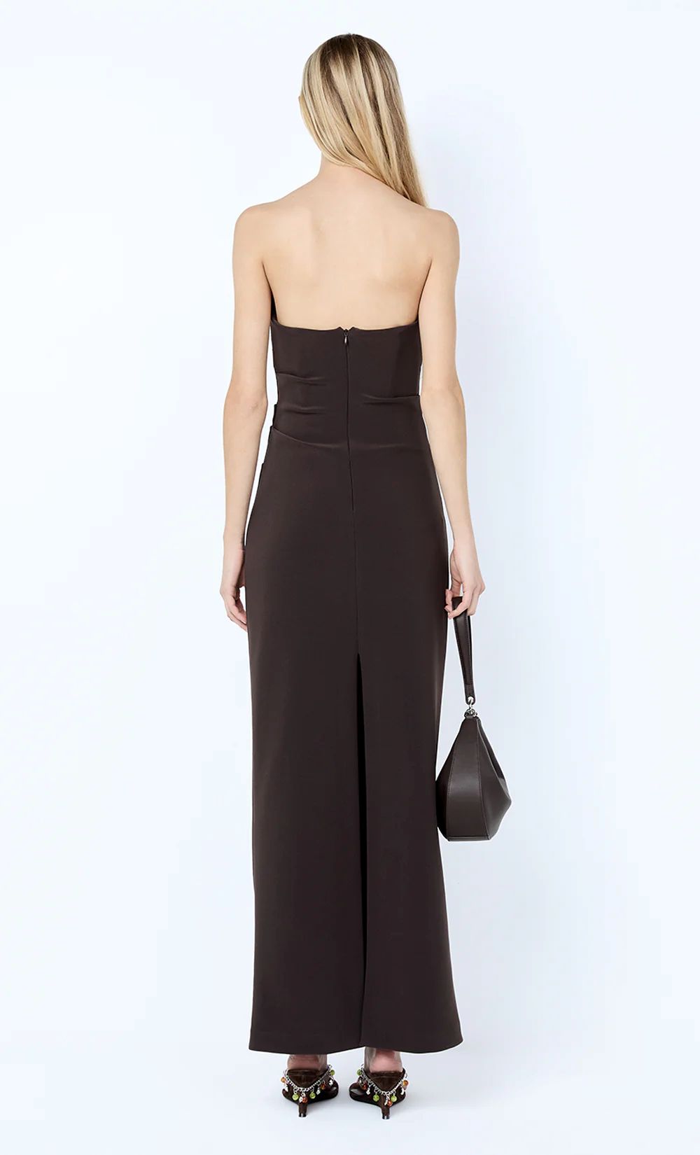 The Lior Strapless Dress in Espresso is a sleek, structured design crafted from signature bonded crepe.