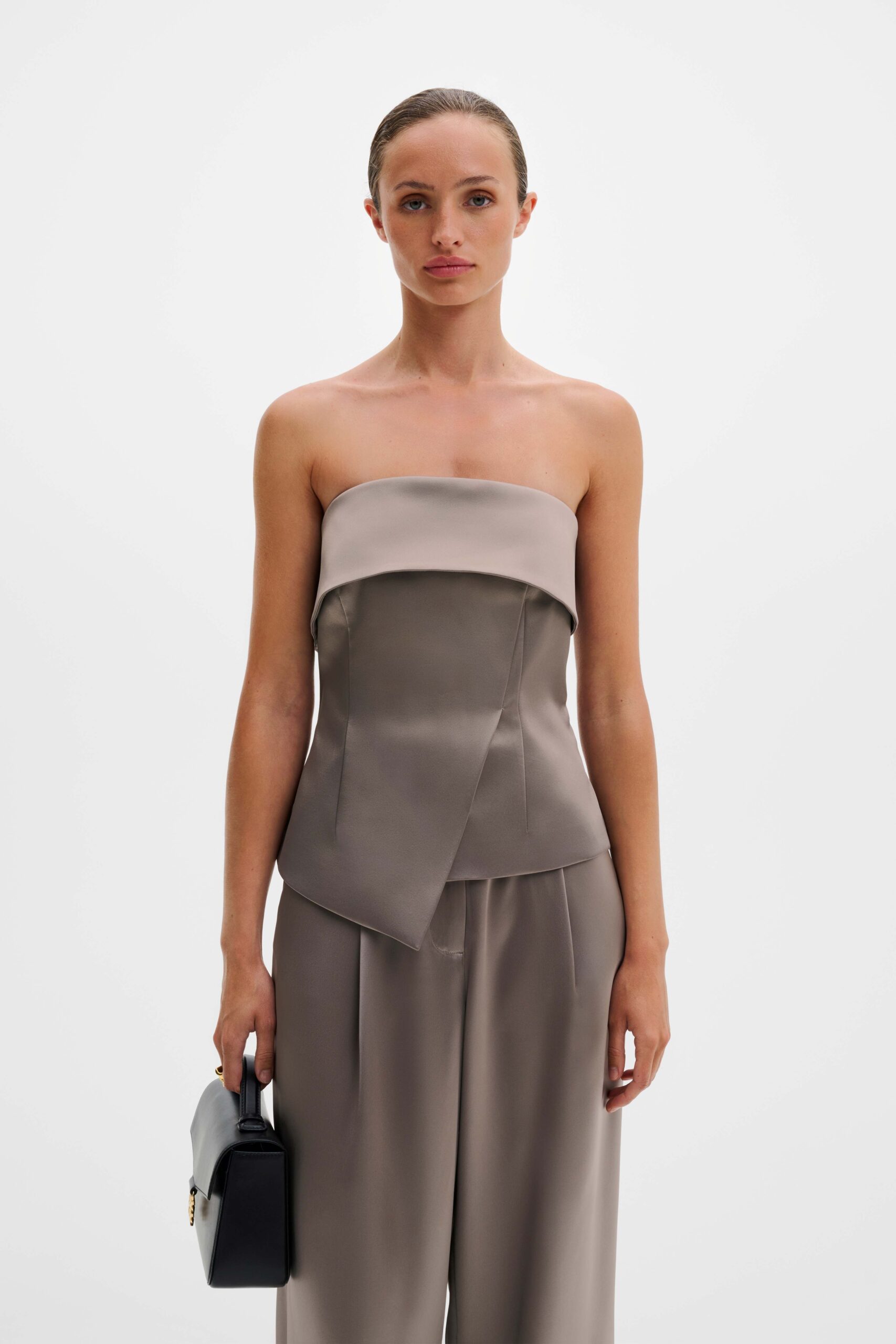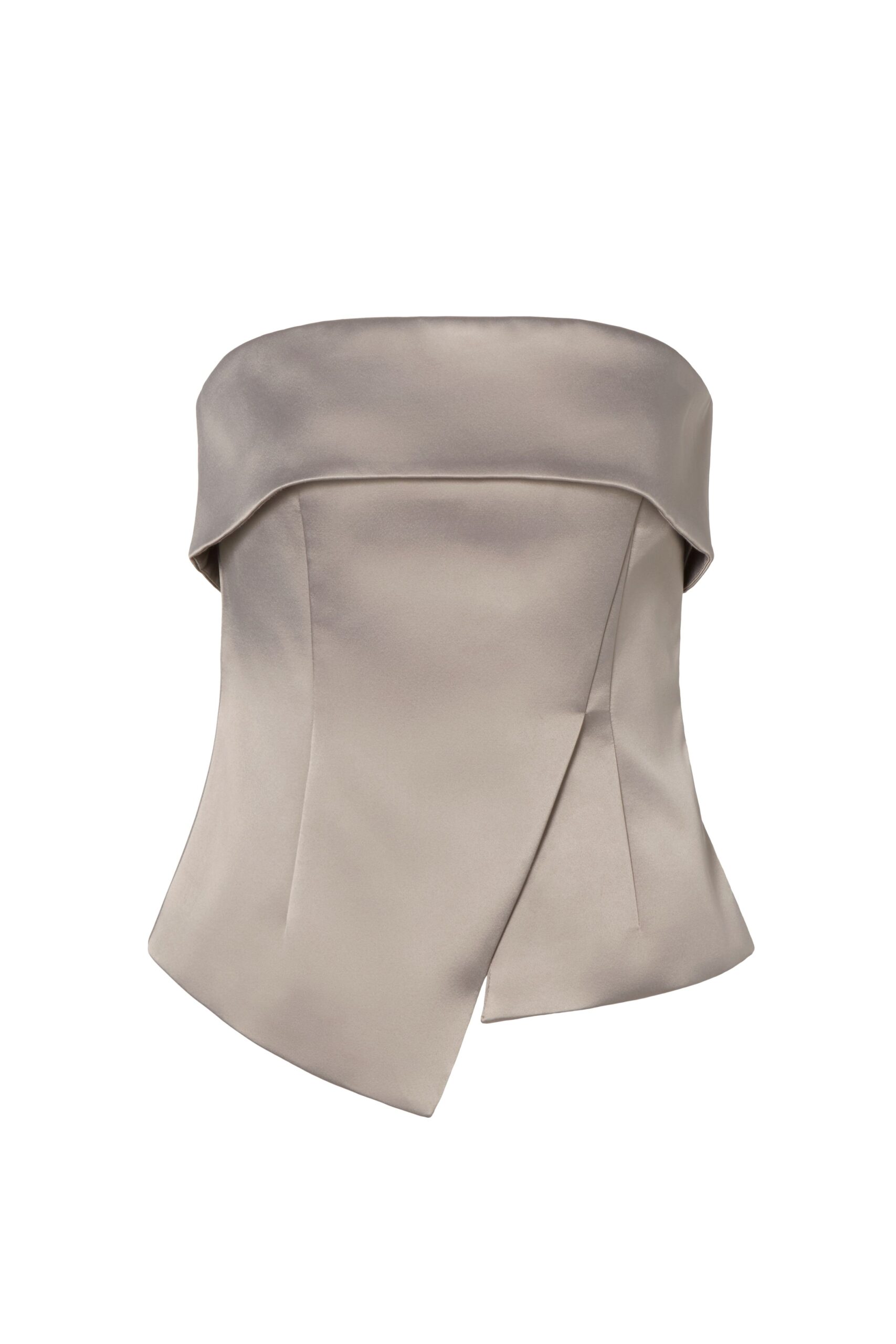 This asymmetric satin bandeau top delivers modern sophistication with its sleek, sculpted silhouette and subtle architectural detailing.