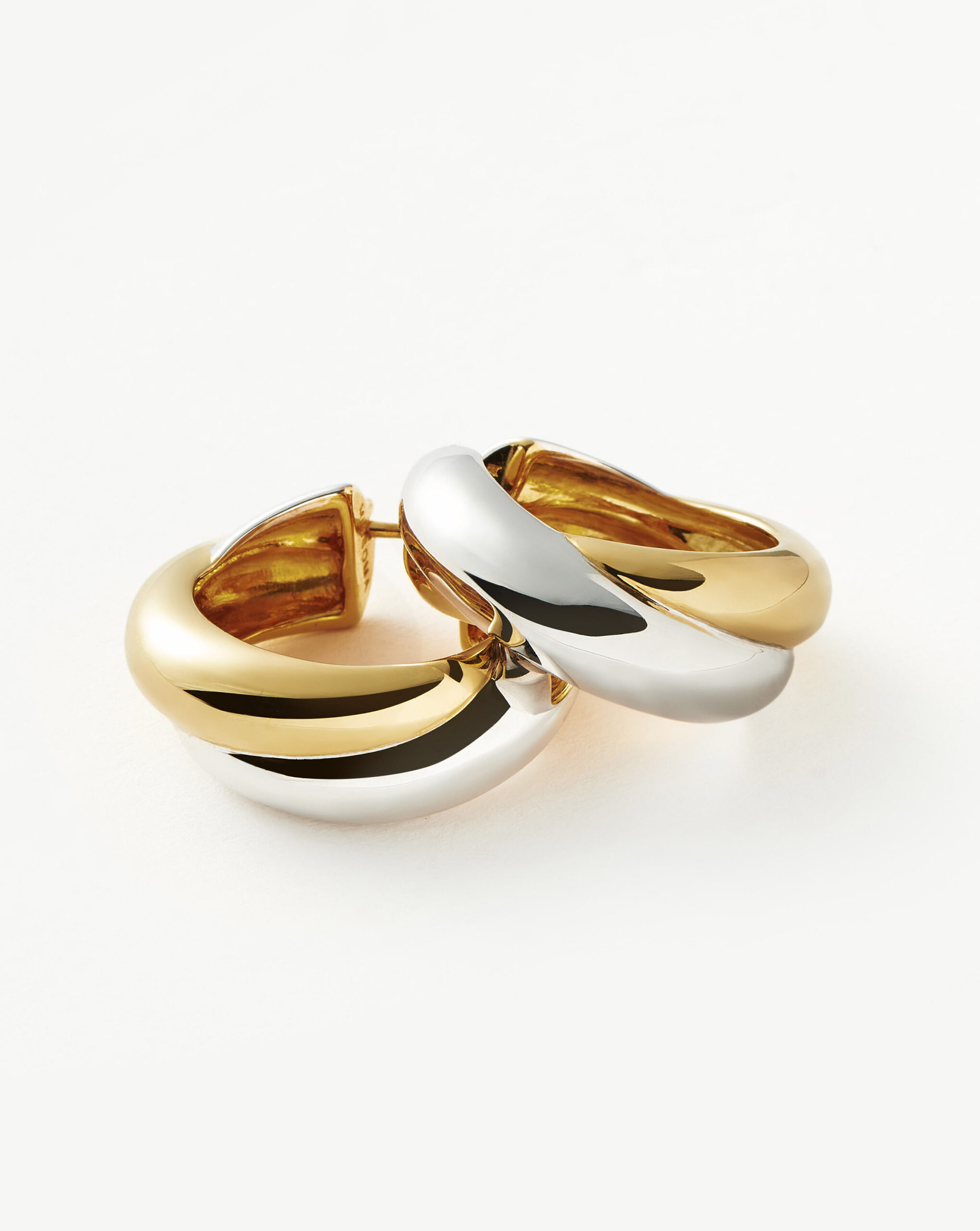 A bold reinterpretation of a classic 80s silhouette, these statement hoop earrings feature a sculptural crossover design in mixed gold and silver tones.