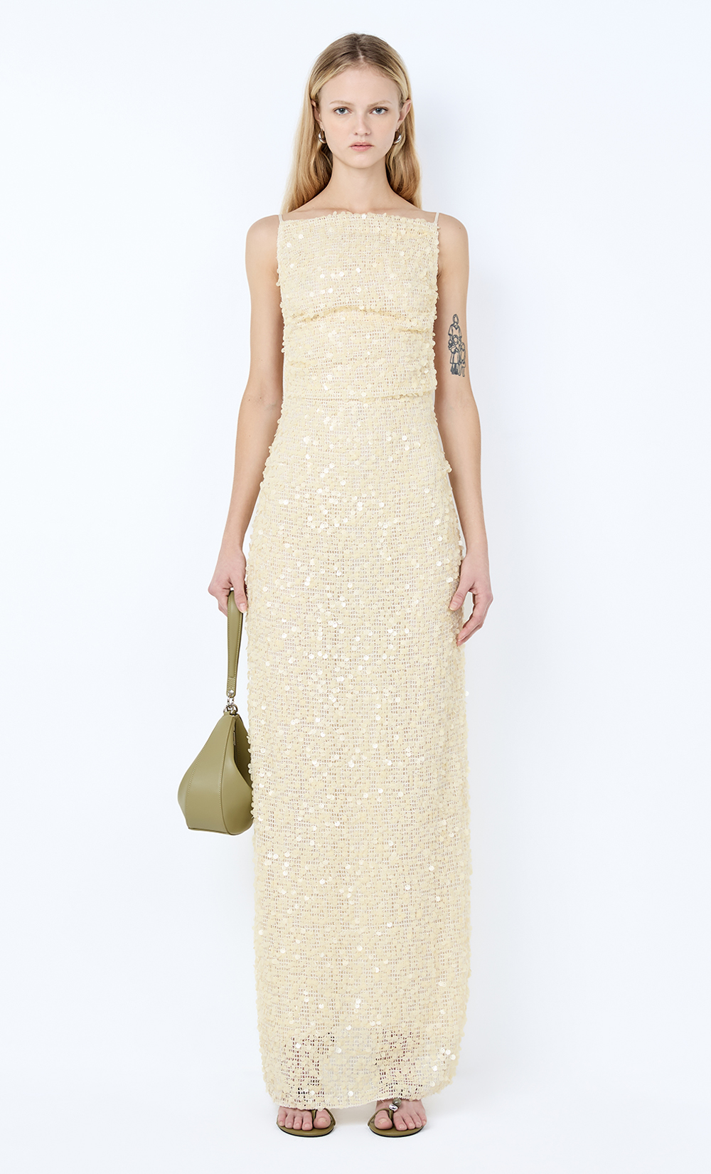 This elegant slip maxi dress is designed with a fluid drape and a clean square neckline for modern appeal.