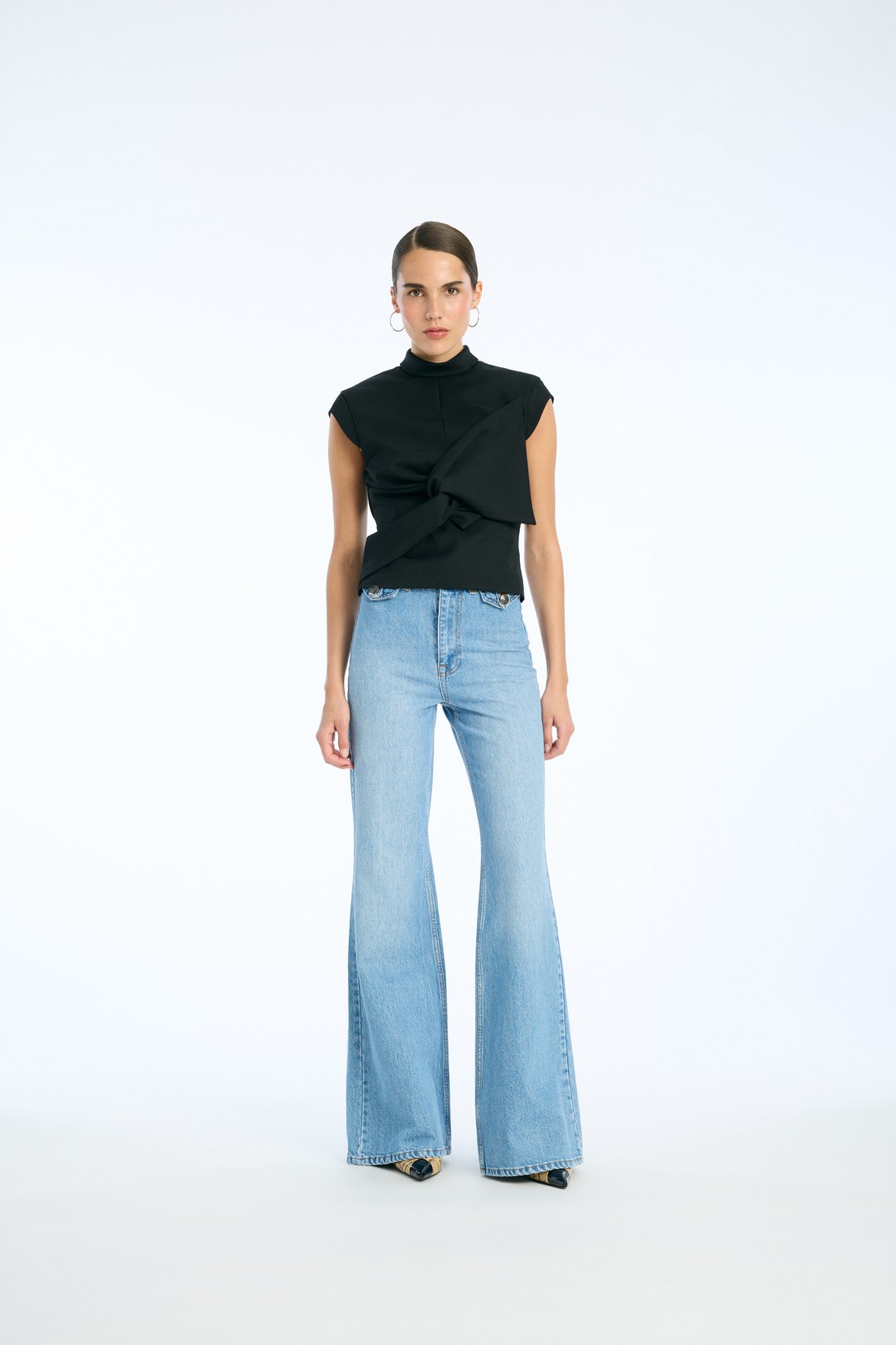 Featuring a deep V-neckline, vintage-inspired butter sleeves, and an empire waist, the fishtail skirt flows gracefully.