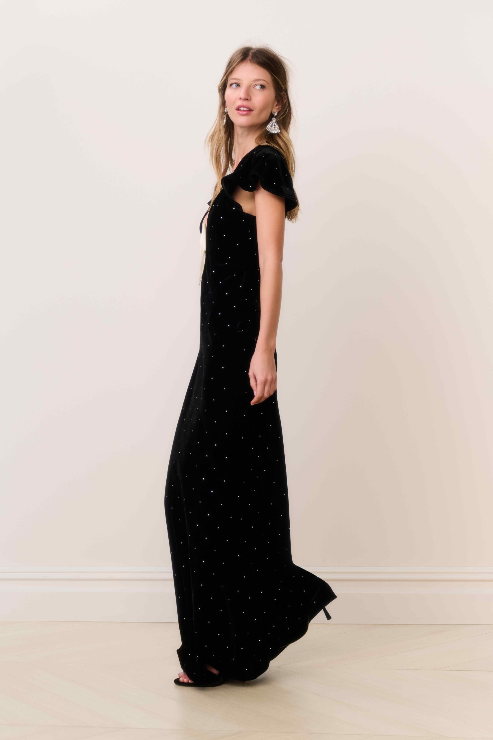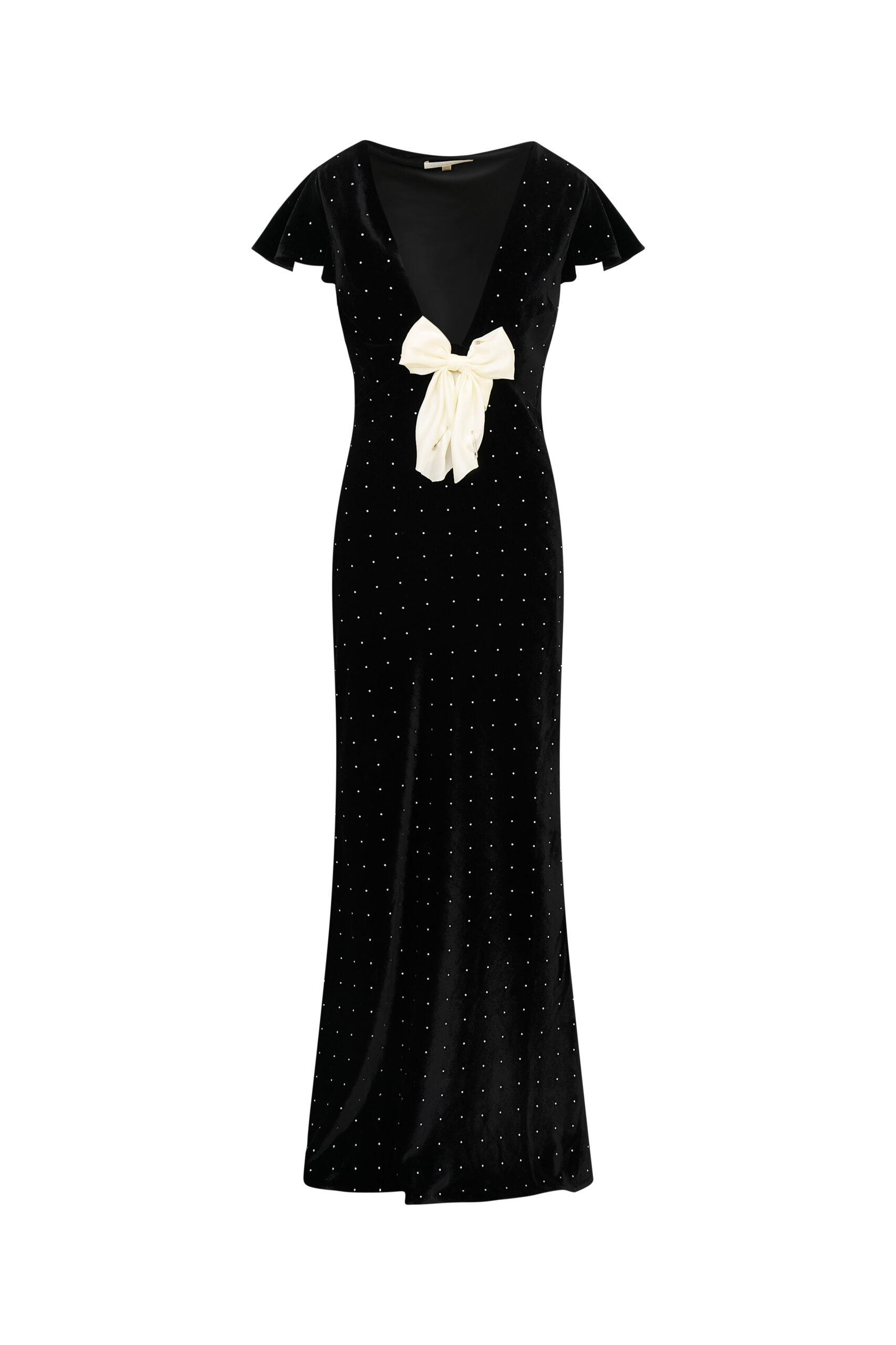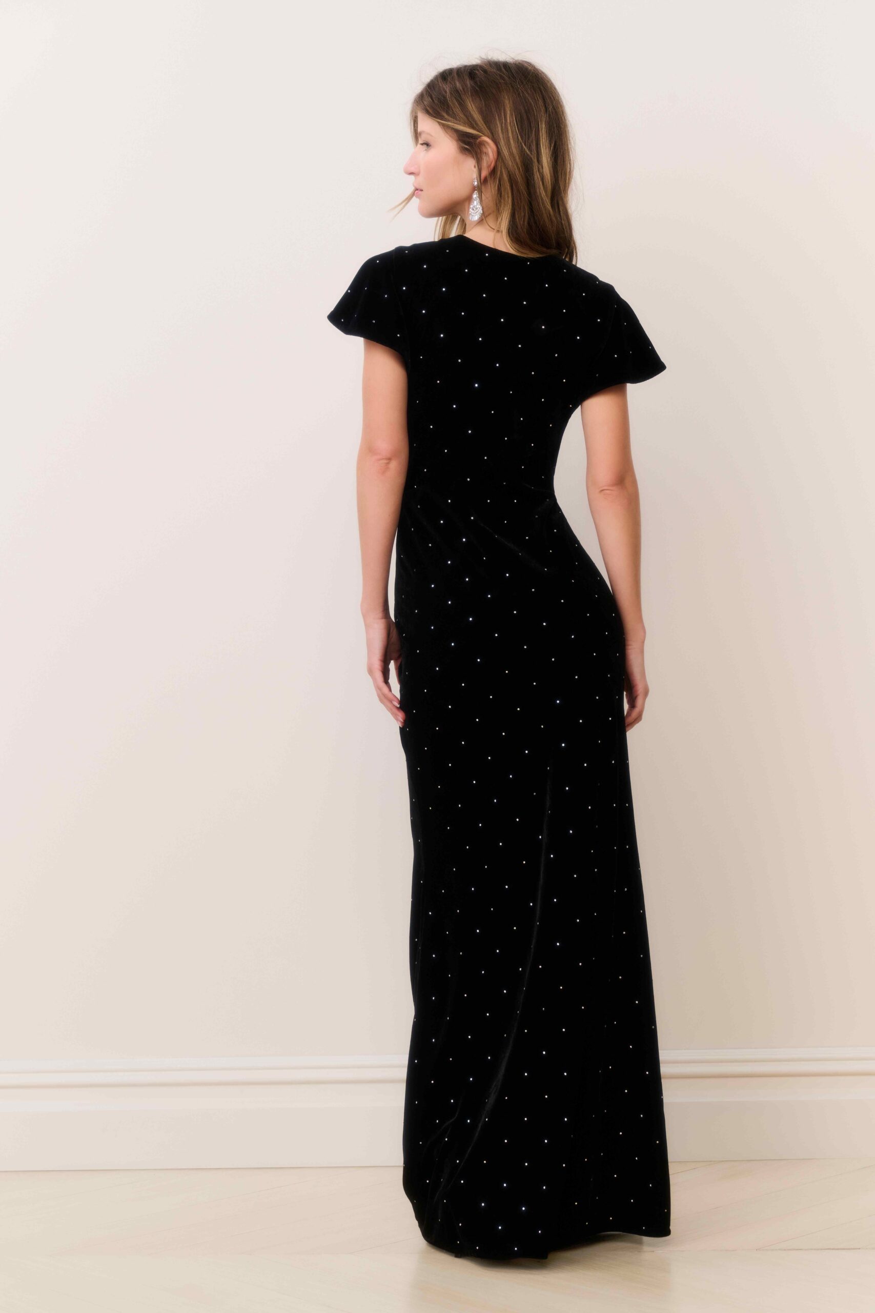 Crafted from luxurious velvet with heat-fixed crystals, the bias-cut fabric shimmers subtly with movement.