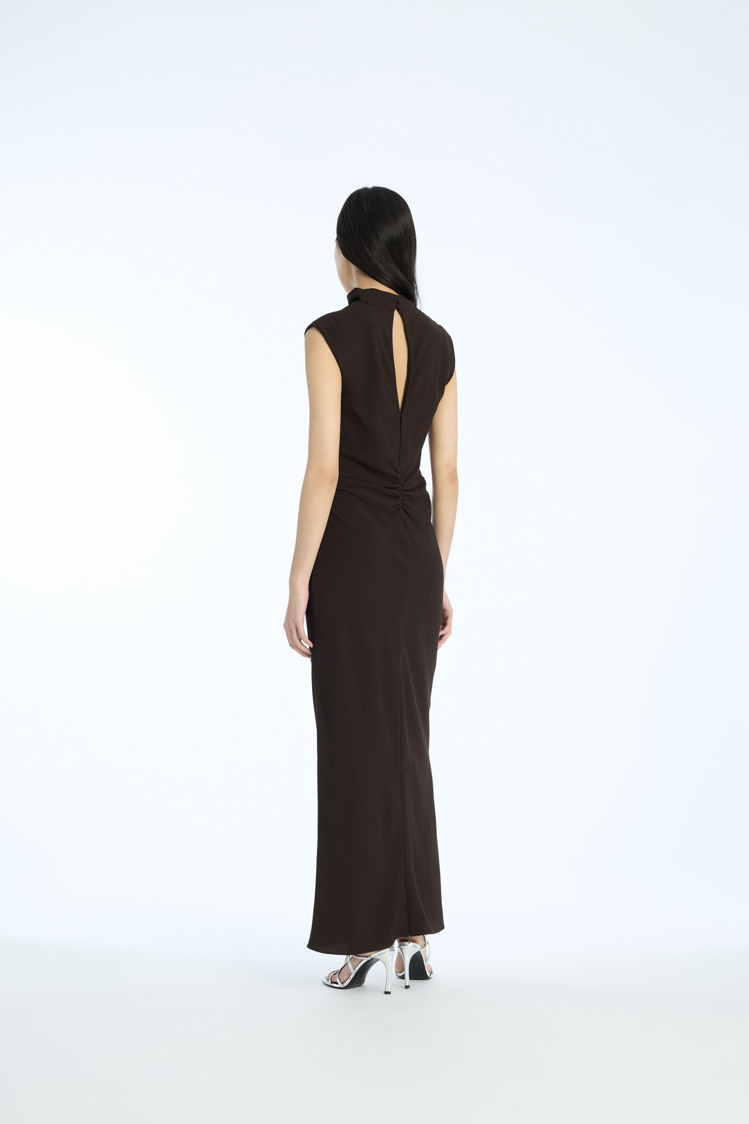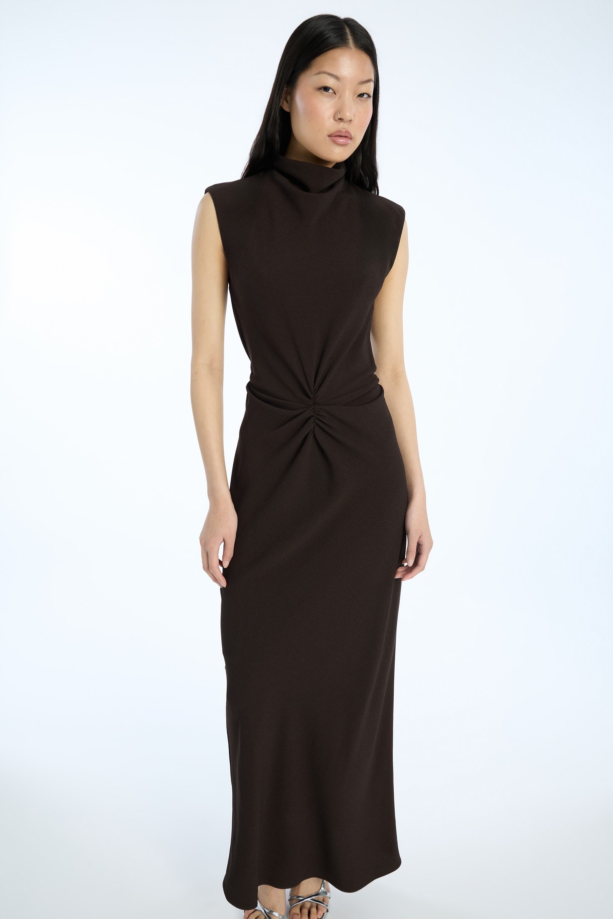 The Midi dress with Gatherings in Dark Brown is a sleek, timeless piece with subtle detailing that elevates everyday elegance.