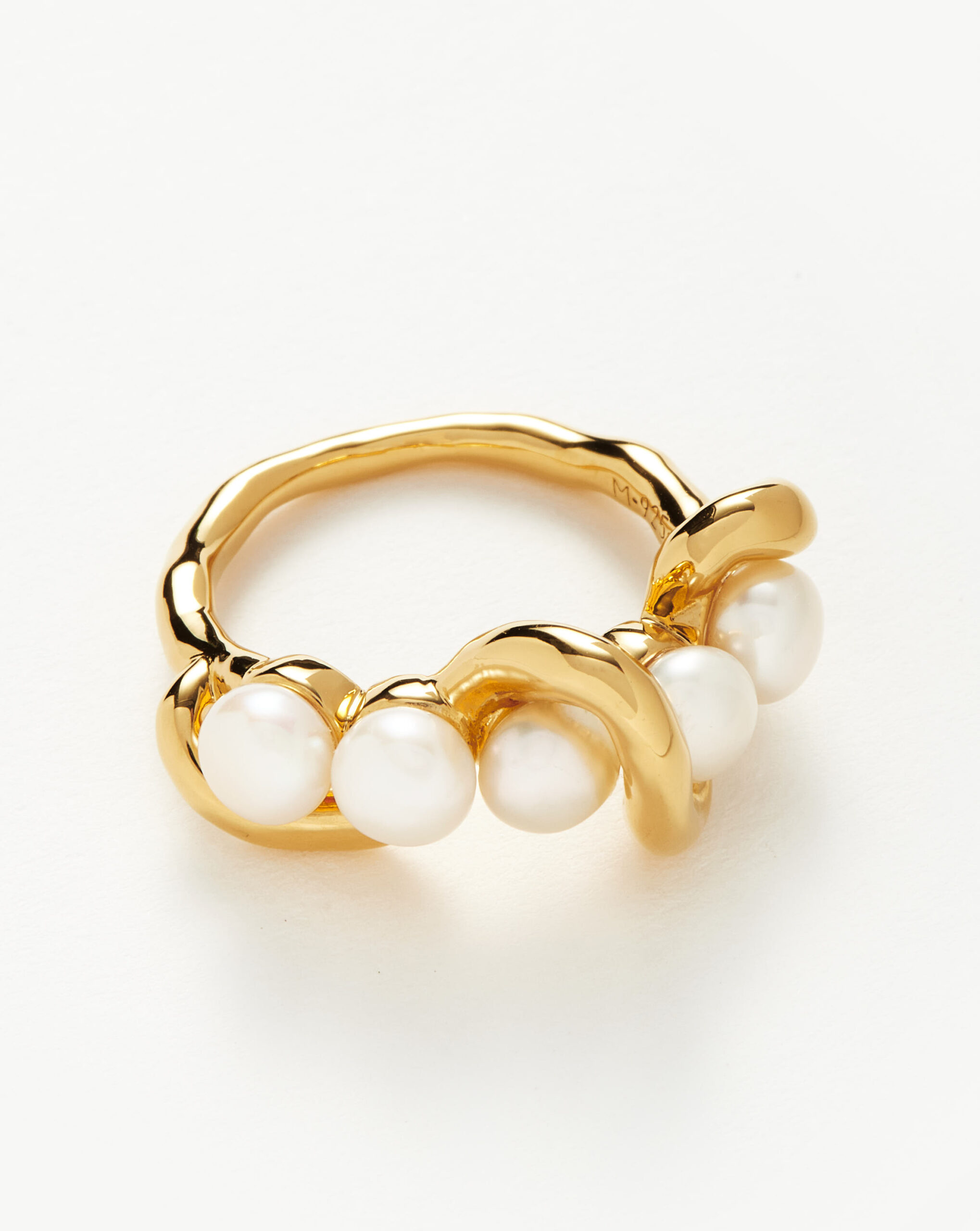A modern interpretation of iconic pearls, this statement ring features a fluid molten band entwined around beaded freshwater pearls.