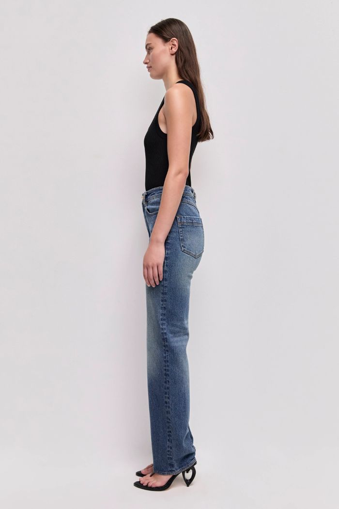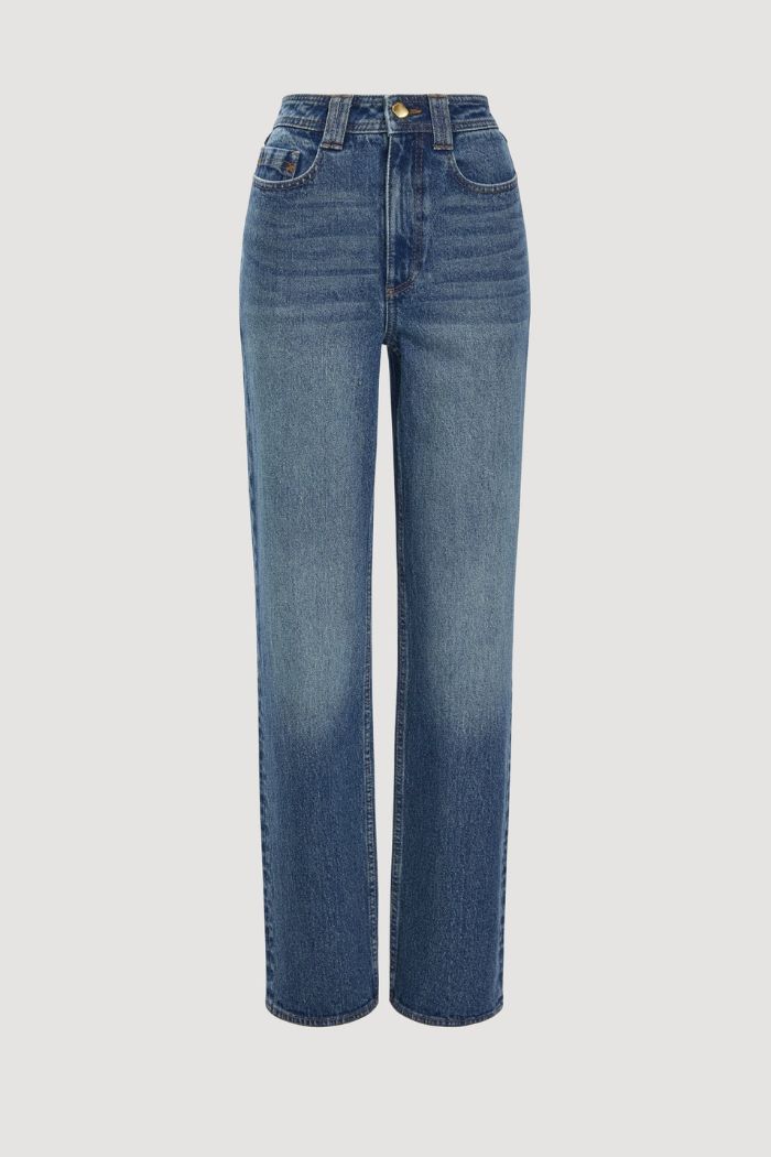 Aje Signature Denim, Slim straight leg silhouette, High waist, Light-stretch denim, Twin needle stitching, Front zip fly, Twin belt loops, Gold hardware, Front pockets, Back pockets, Coin pocket, Cross-back belt loop. Vegan leather logo patch at back.