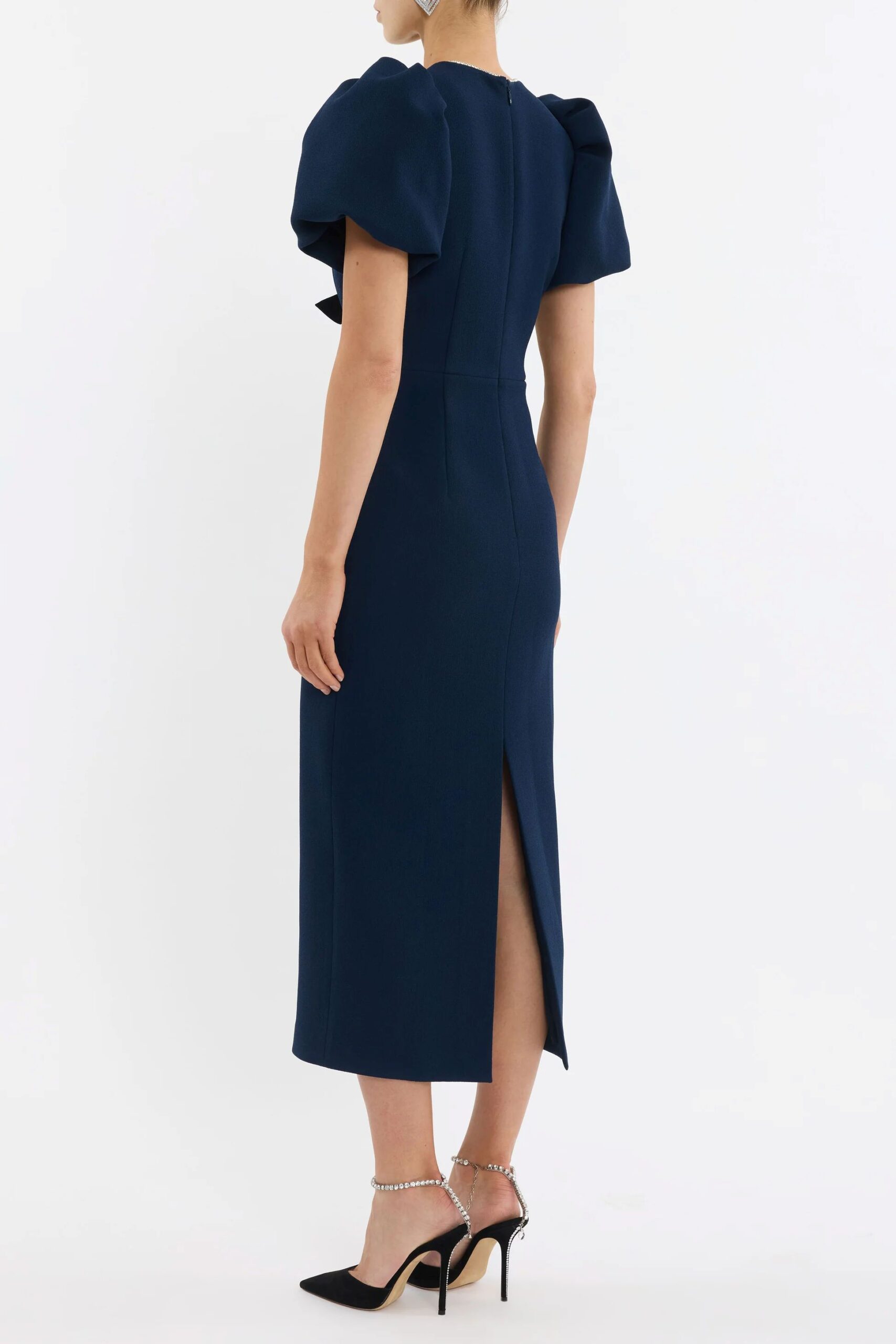 Voluminous puff sleeves, a cinched waist, and a pencil midi skirt with a back split create a flattering, feminine silhouette.