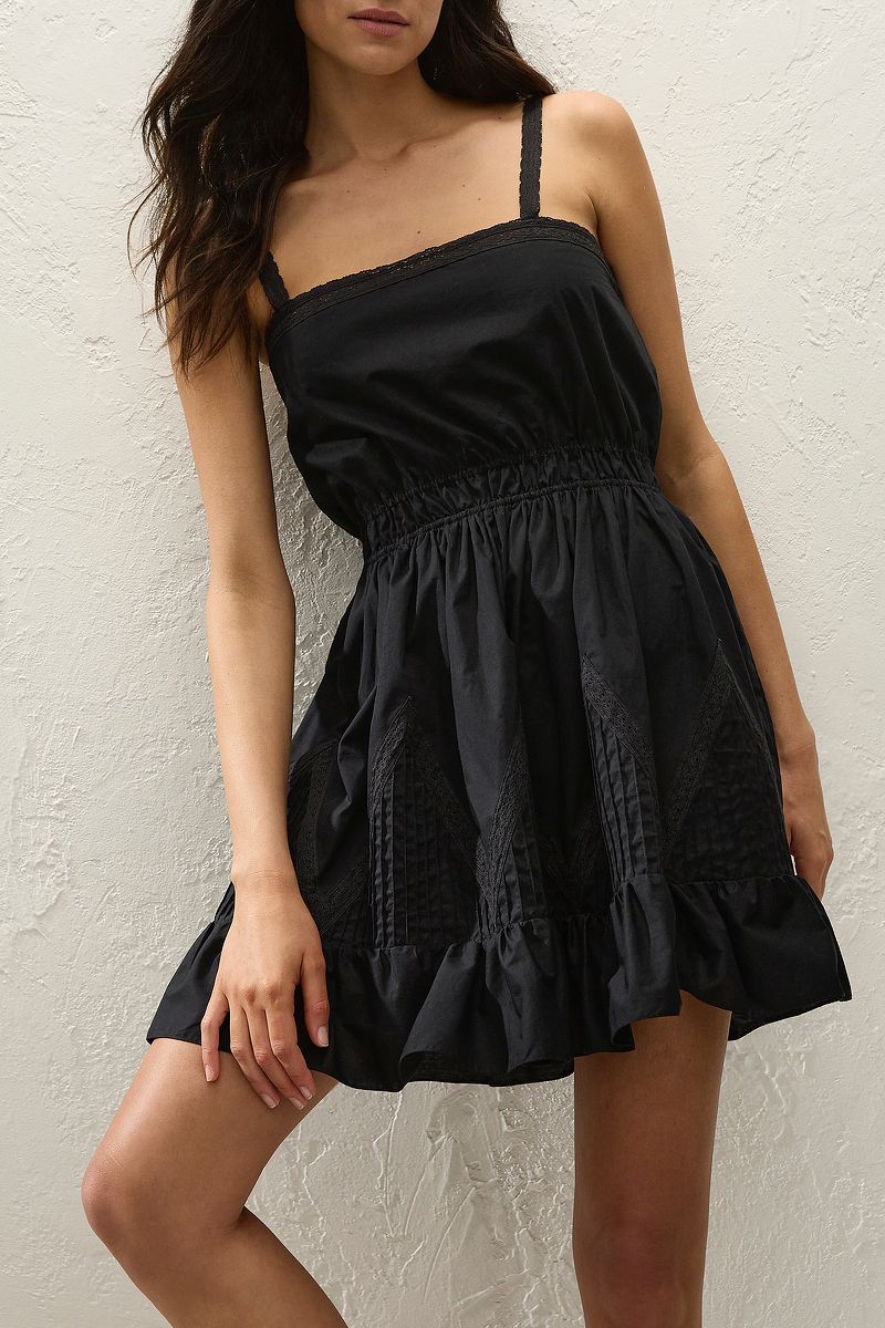 Designed with delicate straps, subtle lace trim detailing and a gathered waist, it falls into a relaxed skirt with a soft ruffled hem for an easy, flattering silhouette.