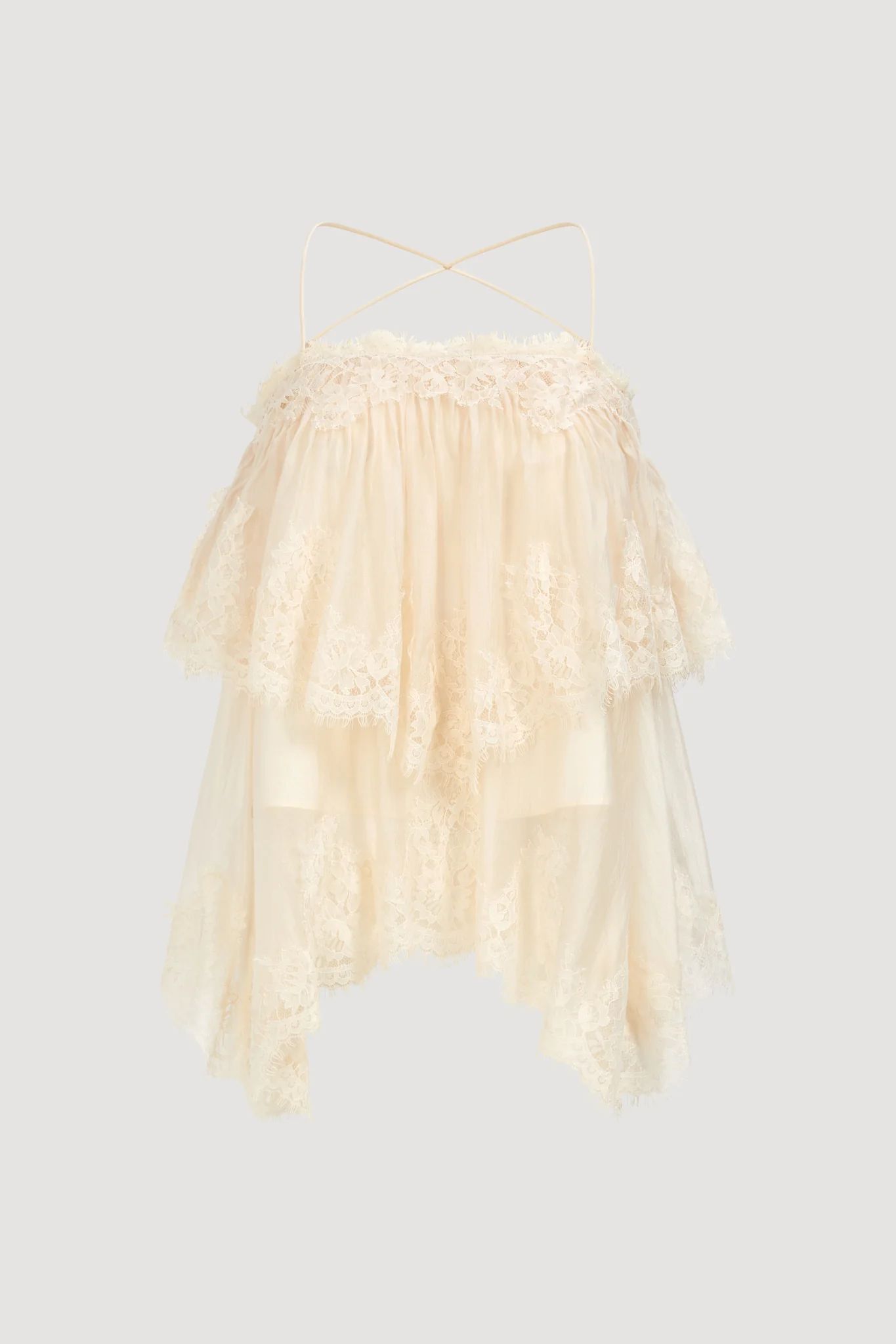 A layered hem with lace detailing adds soft texture and movement, making it a refined piece for both elevated daywear and occasion styling.