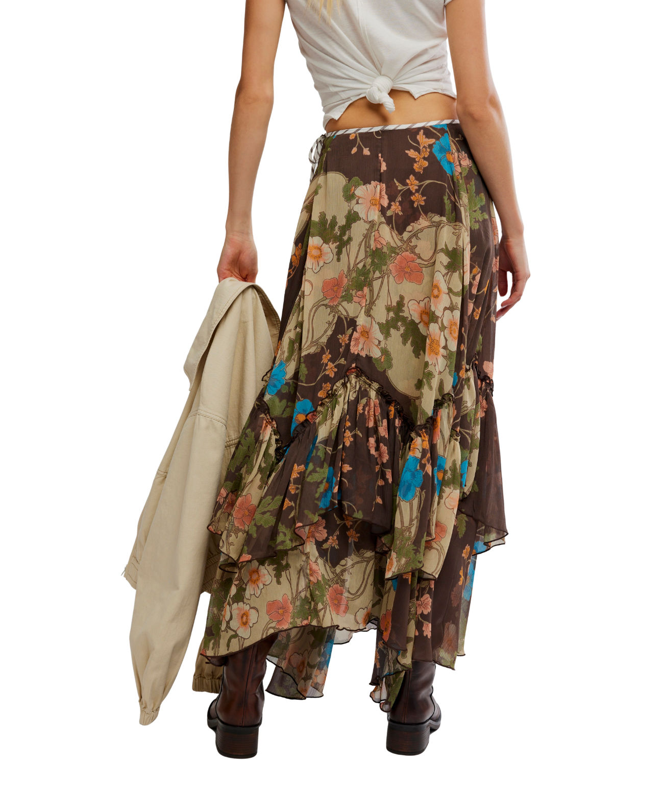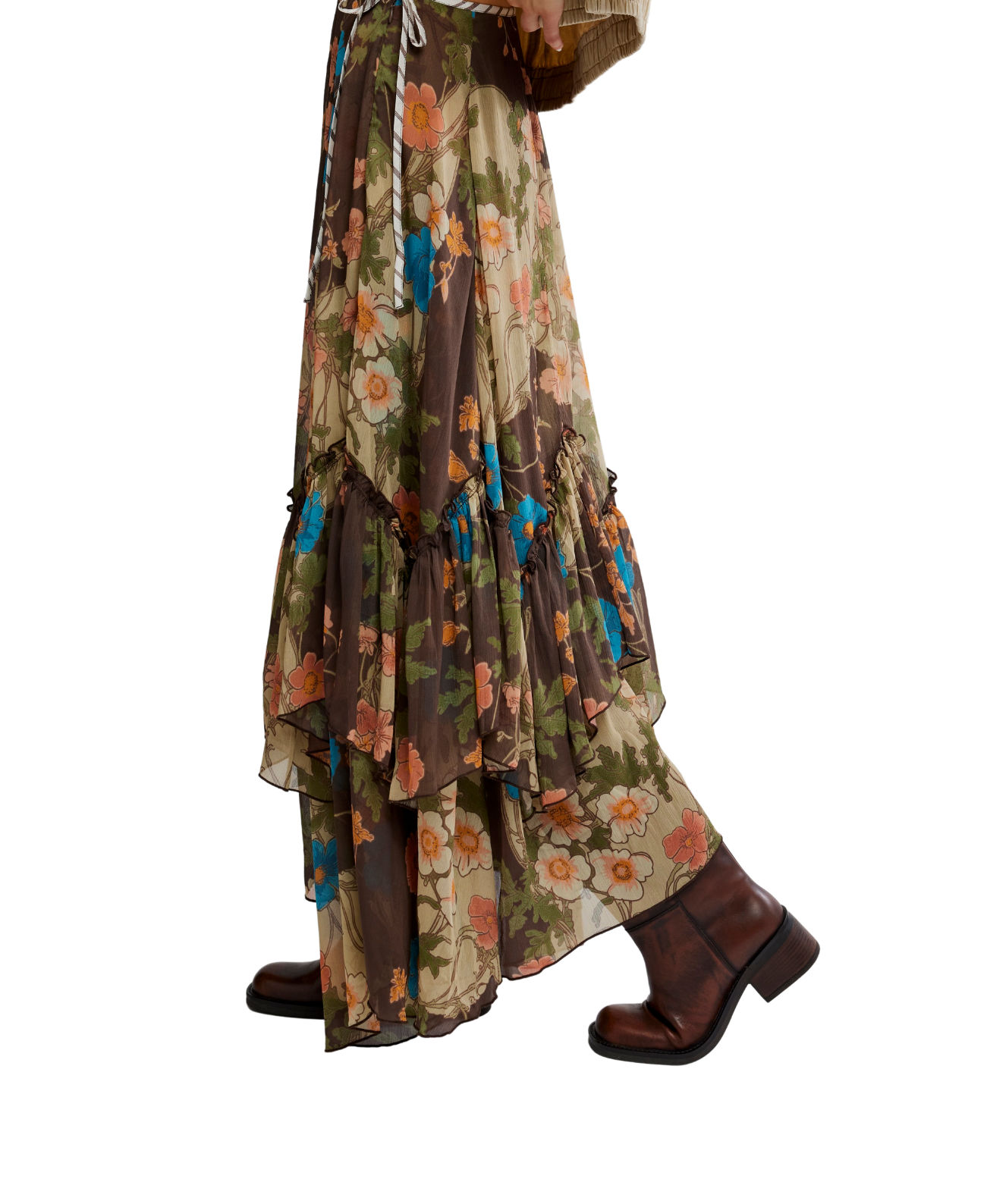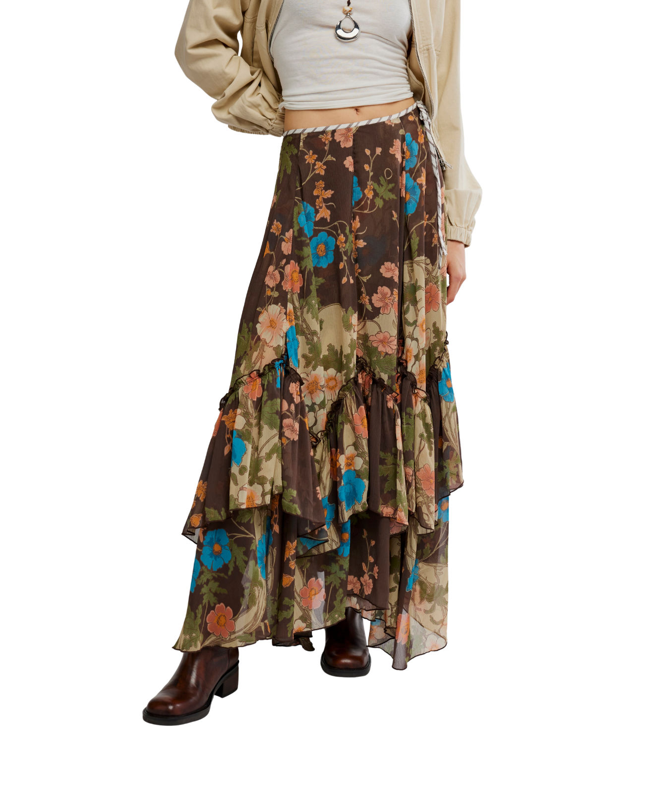 Float through the season in airy chiffon with cascading tiers and a flattering low-rise fit. Designed with a waist tie and soft movement for dramatic impact.