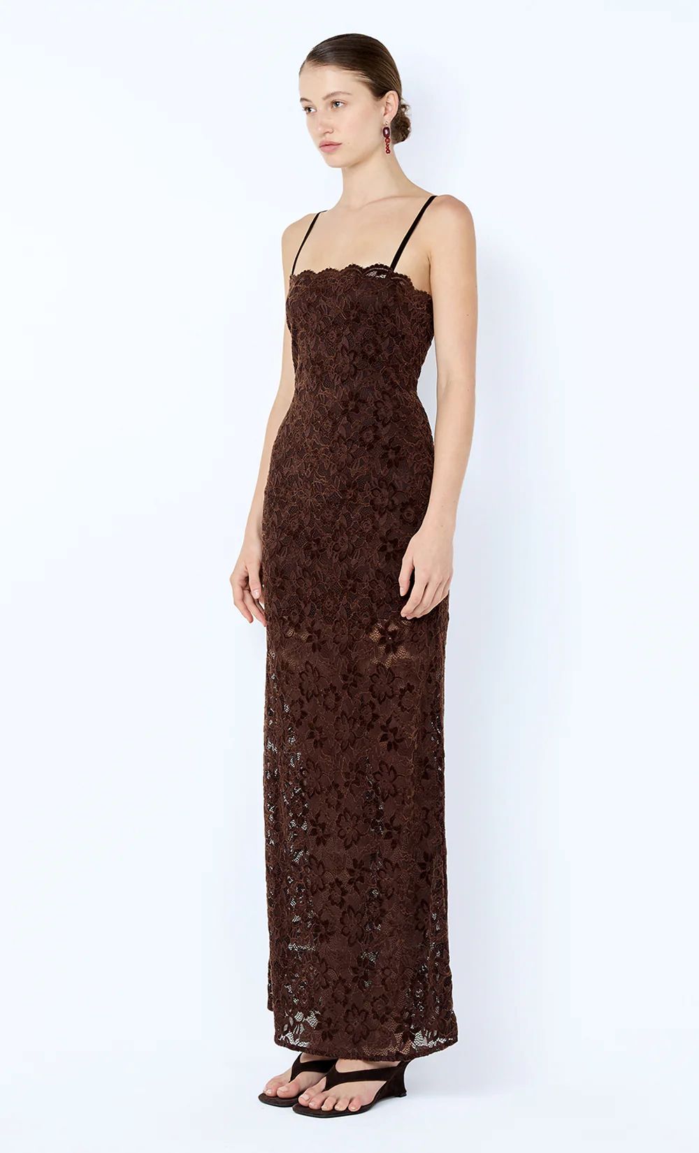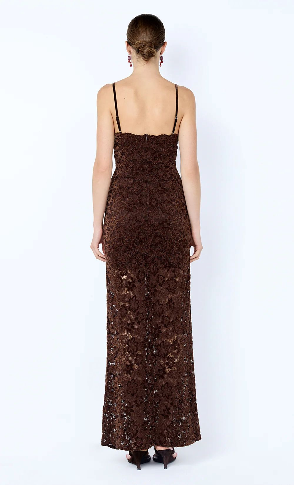 The Pamela Maxi Dress in Chocolate is a refined statement piece designed for elevated evening dressing.