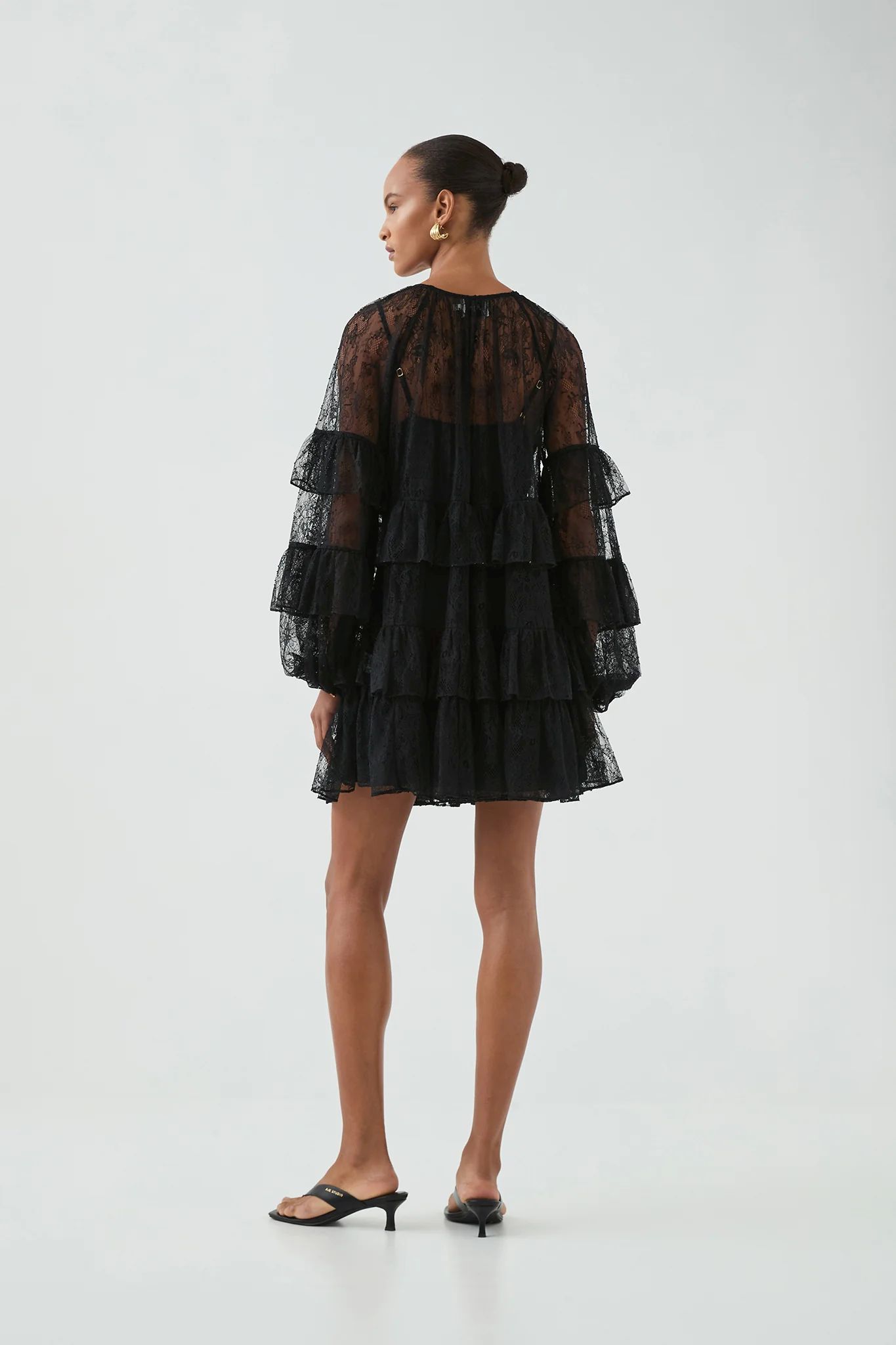 Featuring tiered lace ruffles throughout, creating movement and texture.