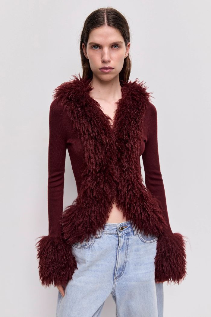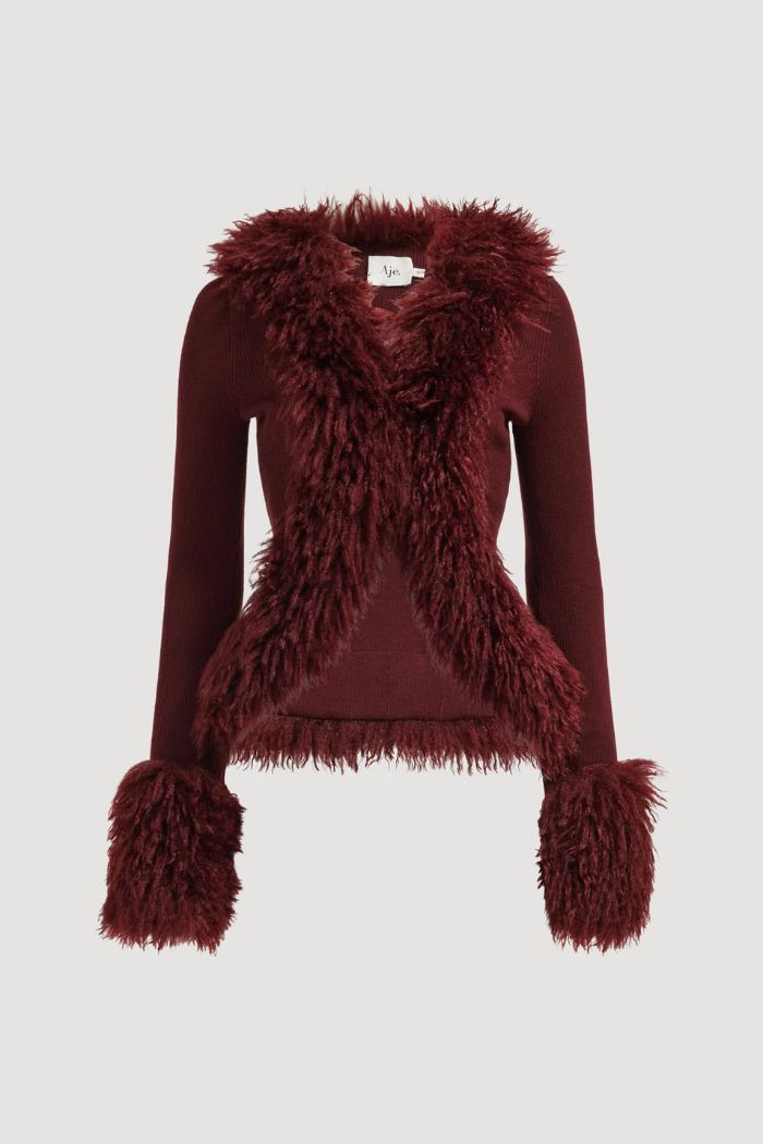 Women’s knitted cardigan, Slim fit, Front feature button closure, Ribbed knit, Faux fur placket and cuff, Aje logo plaque at back neck