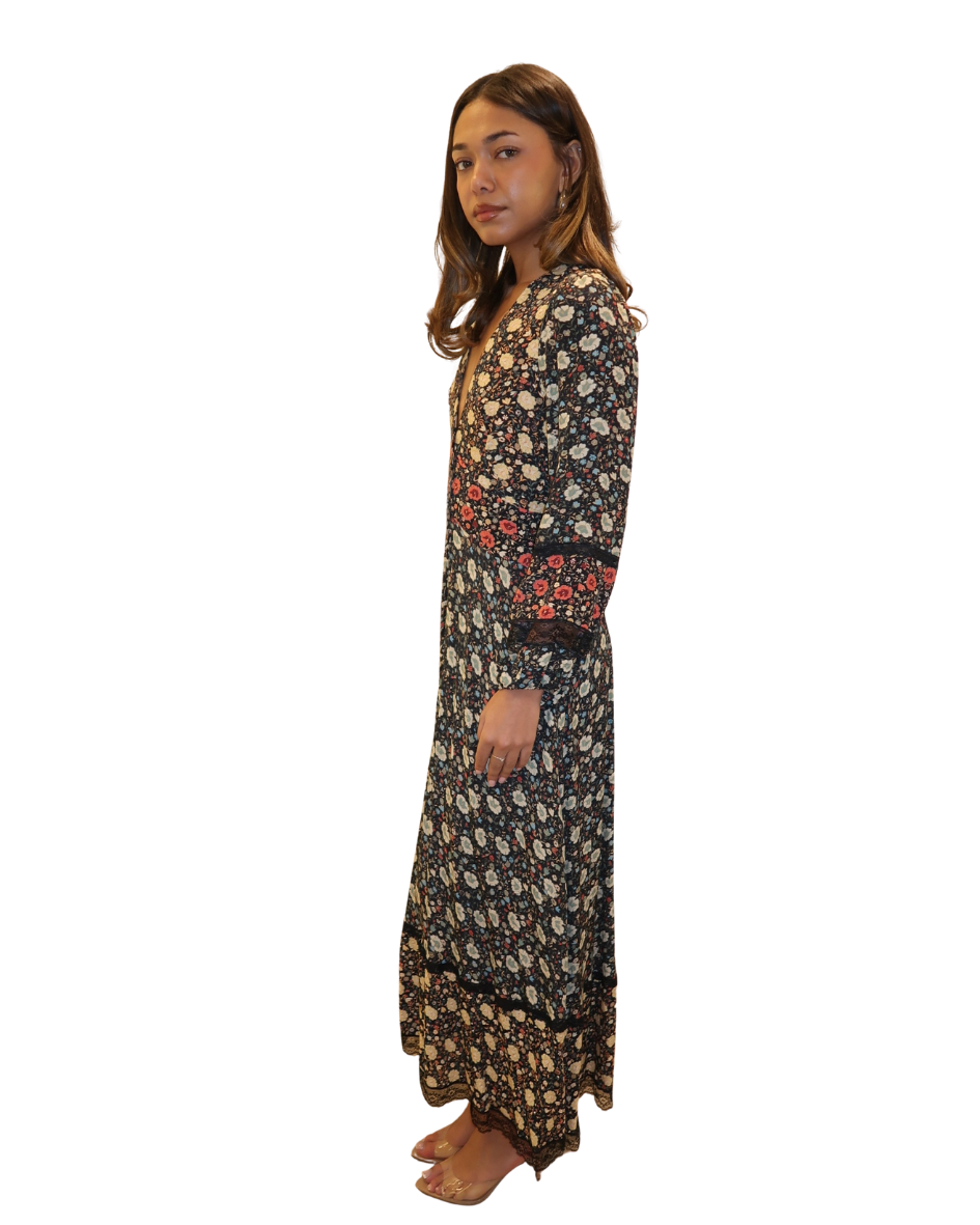 The Raven midi dress blends vintage charm with modern elegance, featuring signature mixed prints and delicate lace trim detailing for a beautifully layered look.