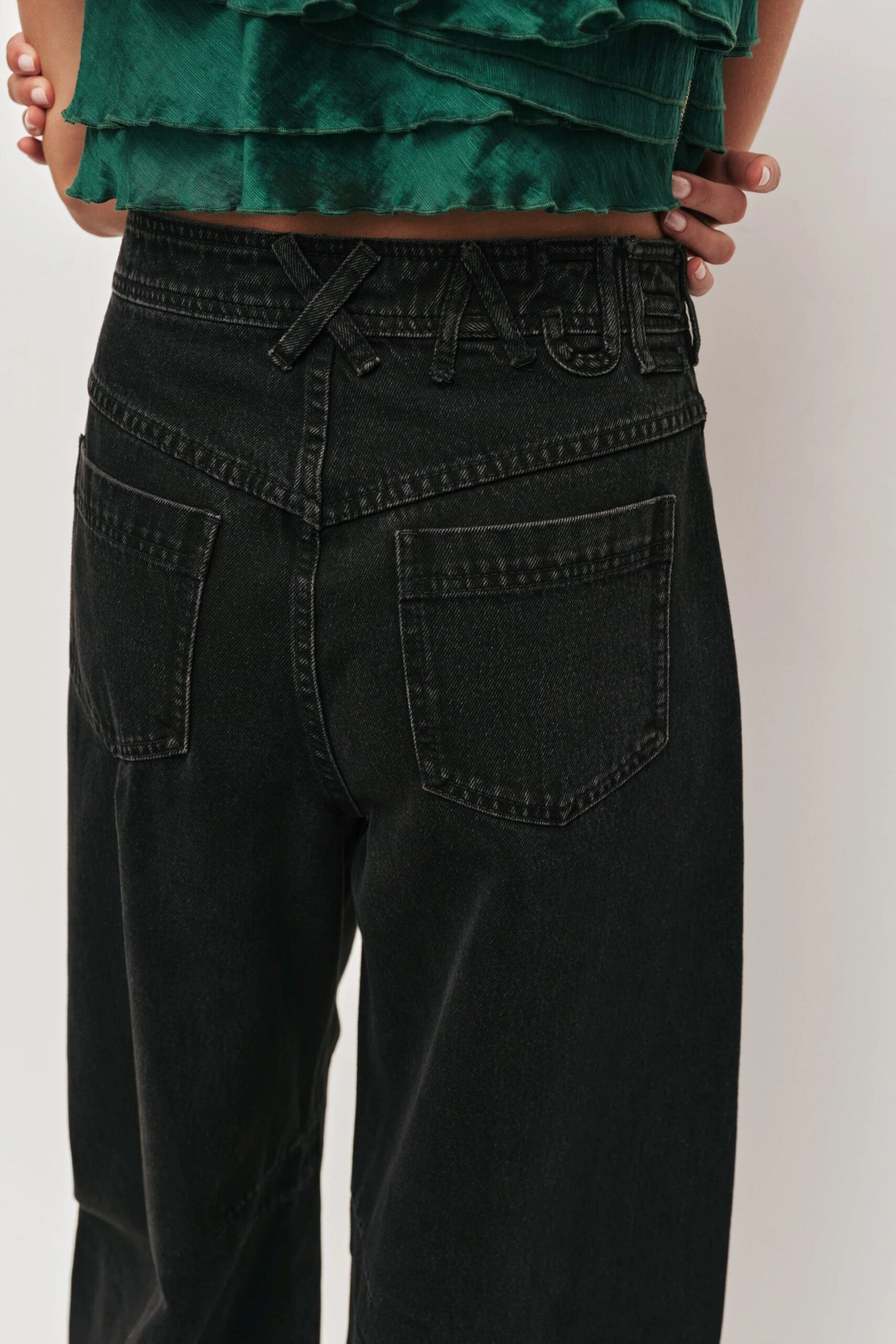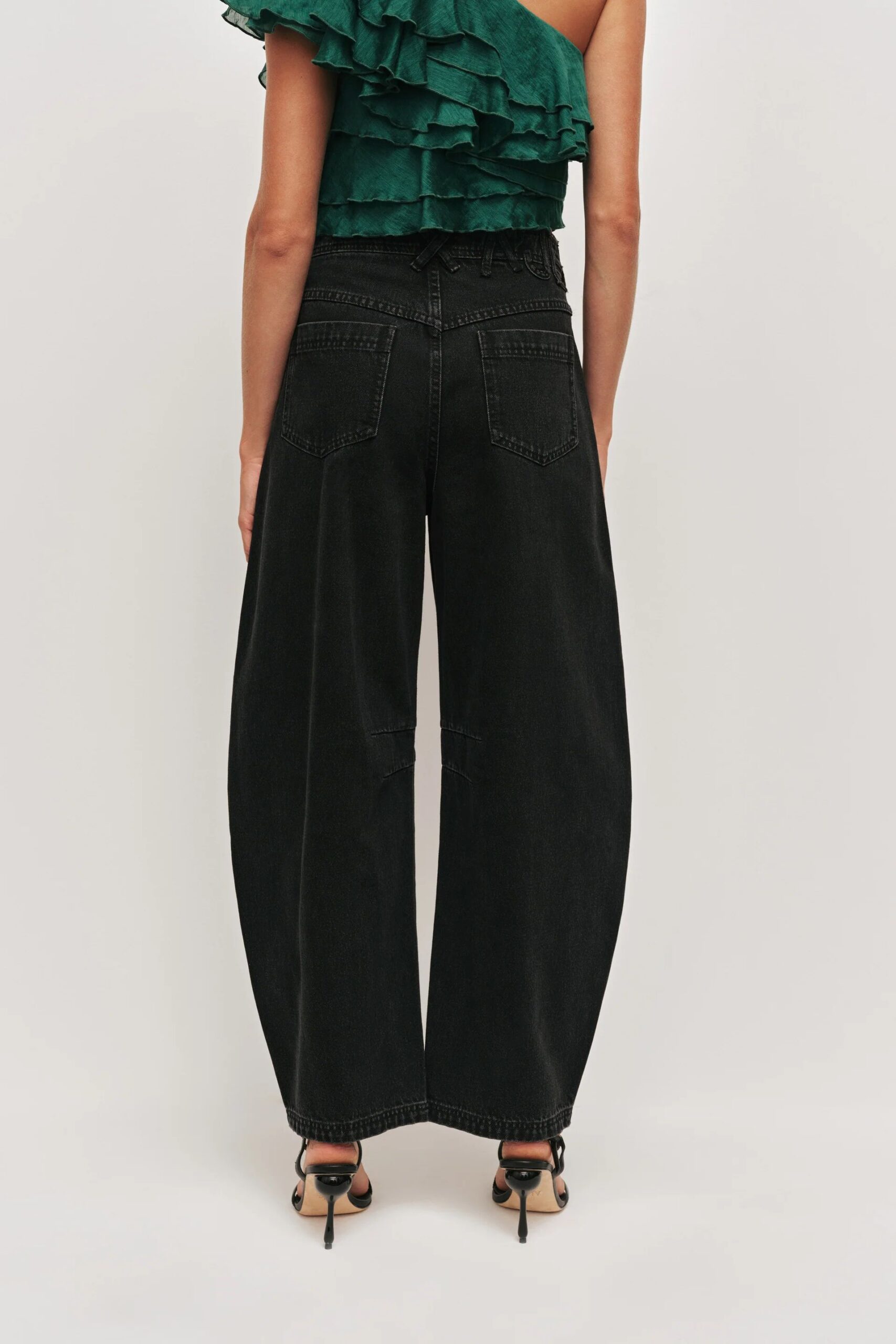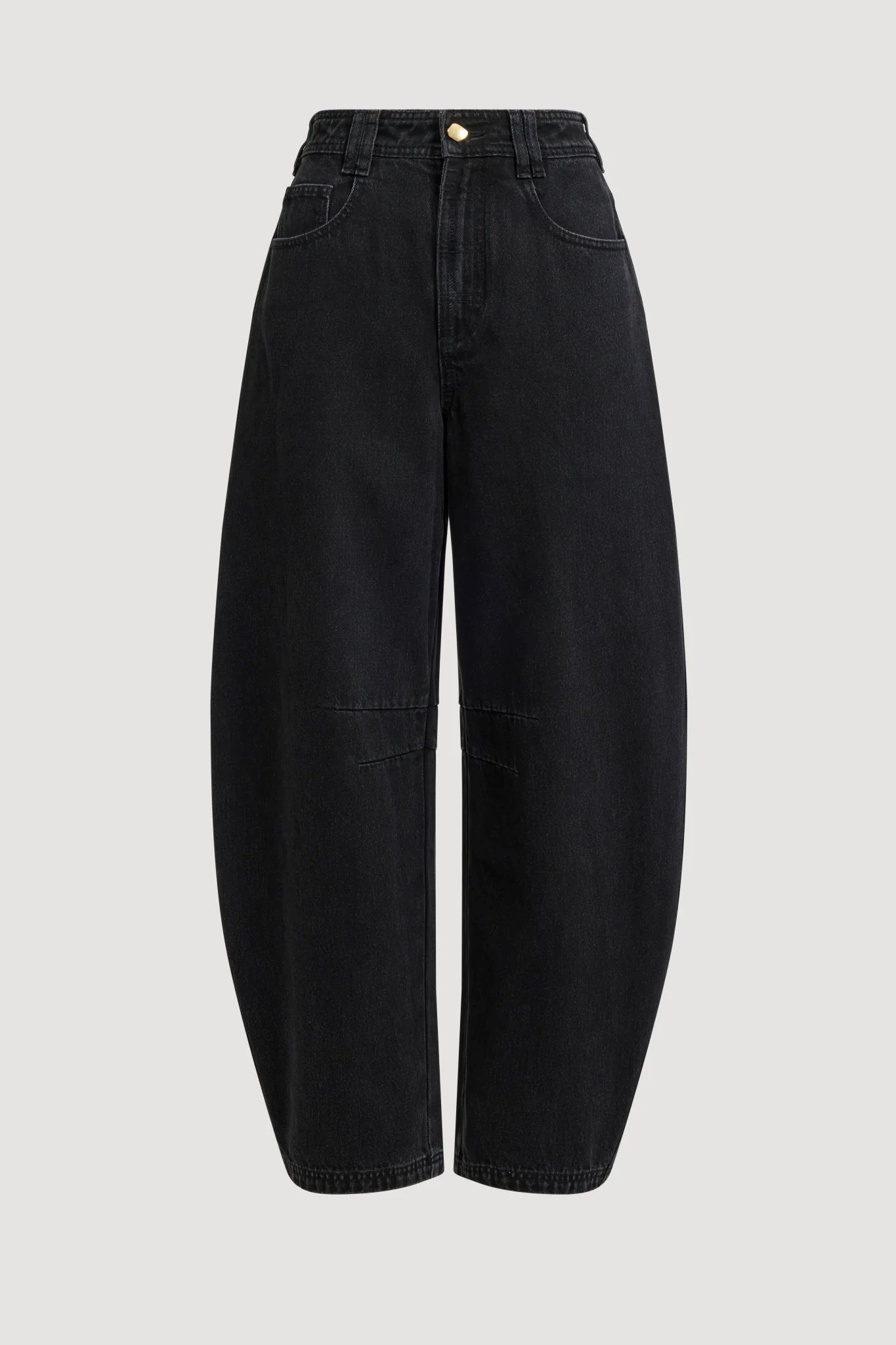 A modern take on classic denim, these barrel leg jeans deliver effortless structure with a relaxed edge. Designed with a low-rise waist and ankle-length cut, the silhouette feels contemporary yet timeless. Crafted from rigid cotton denim, they hold their shape beautifully while refined stitching and gold-tone hardware add a polished finish. An elevated everyday essential that pairs seamlessly with statement tops or crisp shirting.