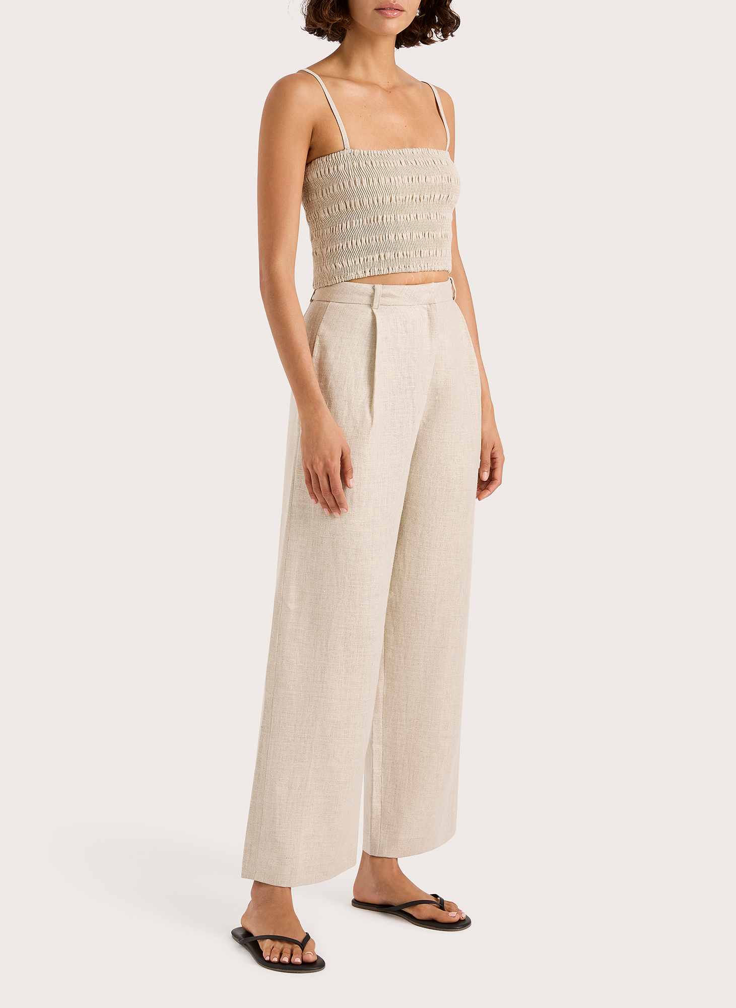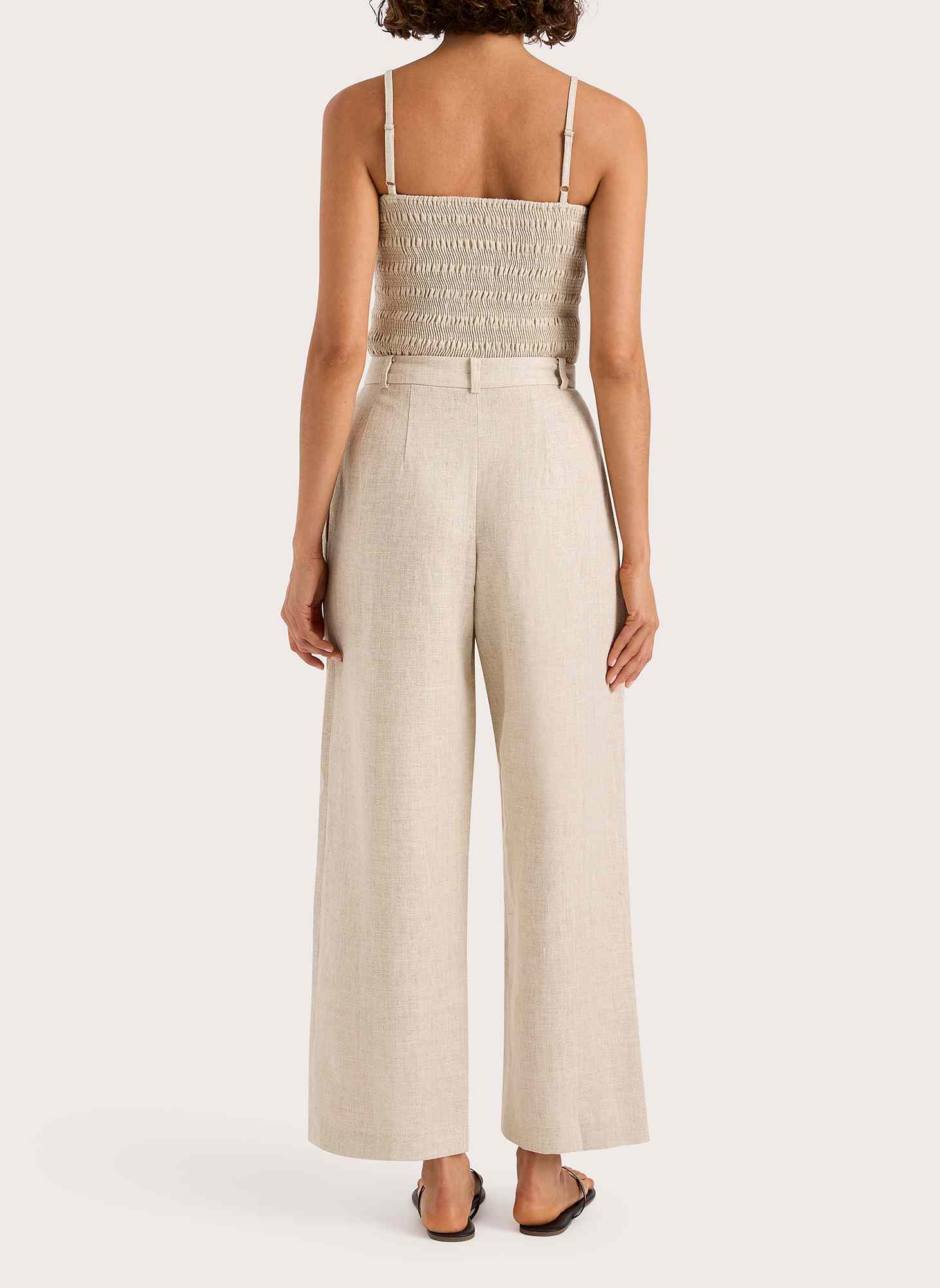 These high-waisted trousers are crafted from 100% European Flax® linen in a warm neutral shade, combining soft tailoring with structured details at the waist, belt loops, and side pockets.