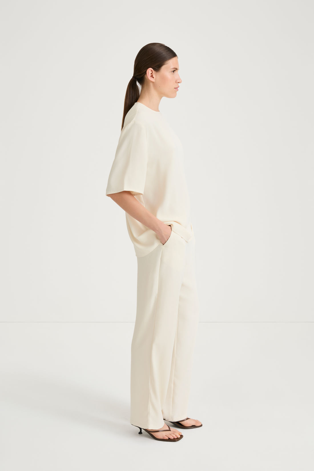 An elevated essential with effortless presence, the Martano Blouse is crafted from smooth matte crepe for a fluid, refined drape. Designed with an extra-oversized silhouette, it features a clean rounded neckline and a subtle centre-back seam finished with a delicate keyhole opening. A small button and inner elastic loop provide a discreet closure, maintaining the blouse’s understated, modern aesthetic.