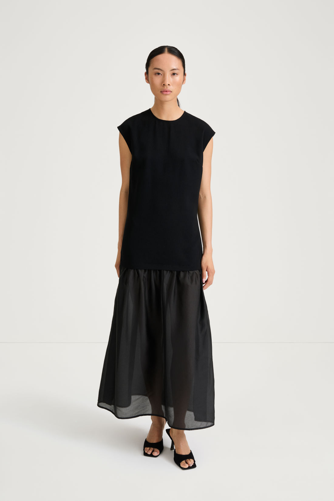 The pleated bodice, generous neckline, and ruffle accents create a silhouette that’s both flattering and timeless.