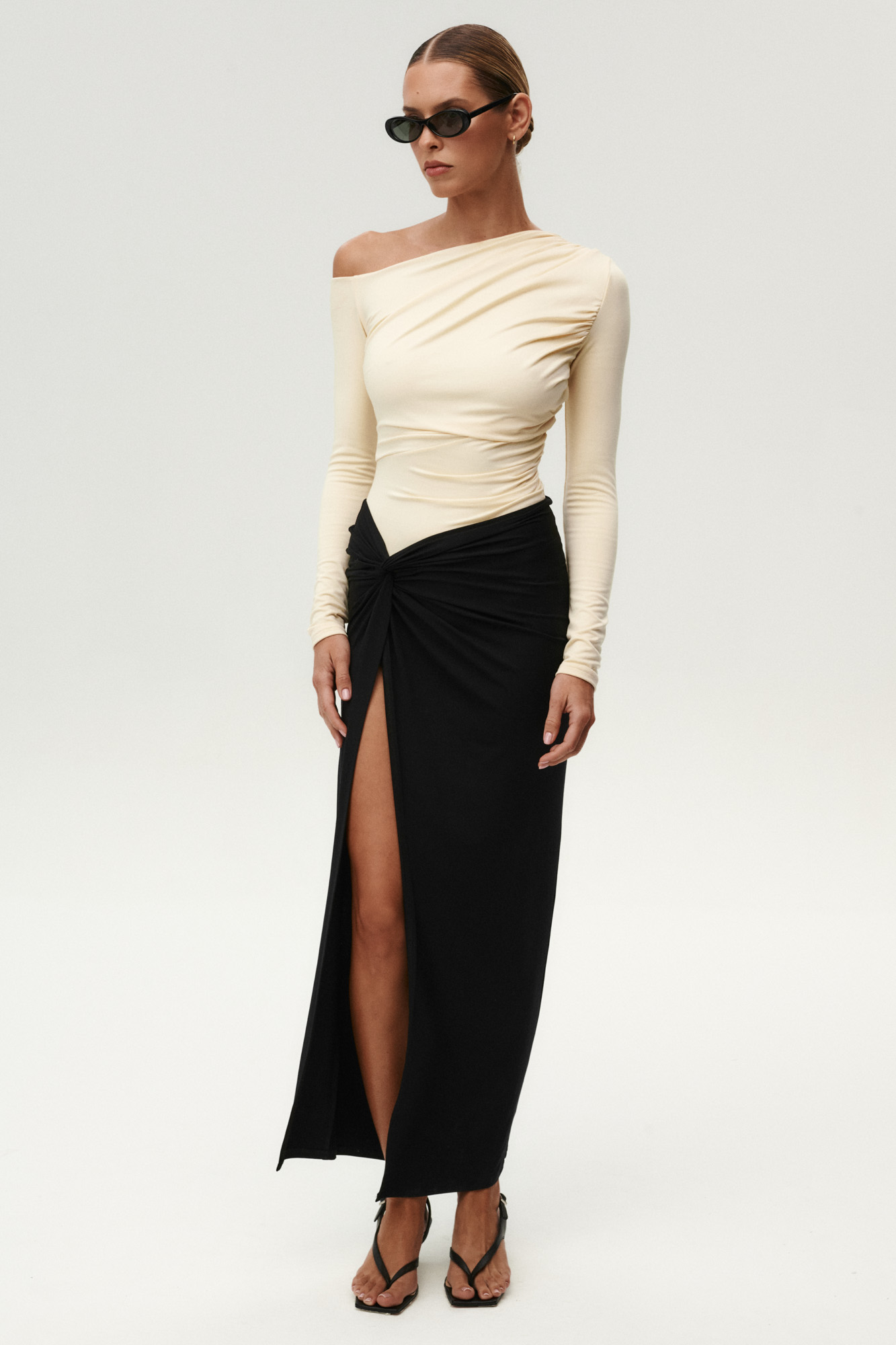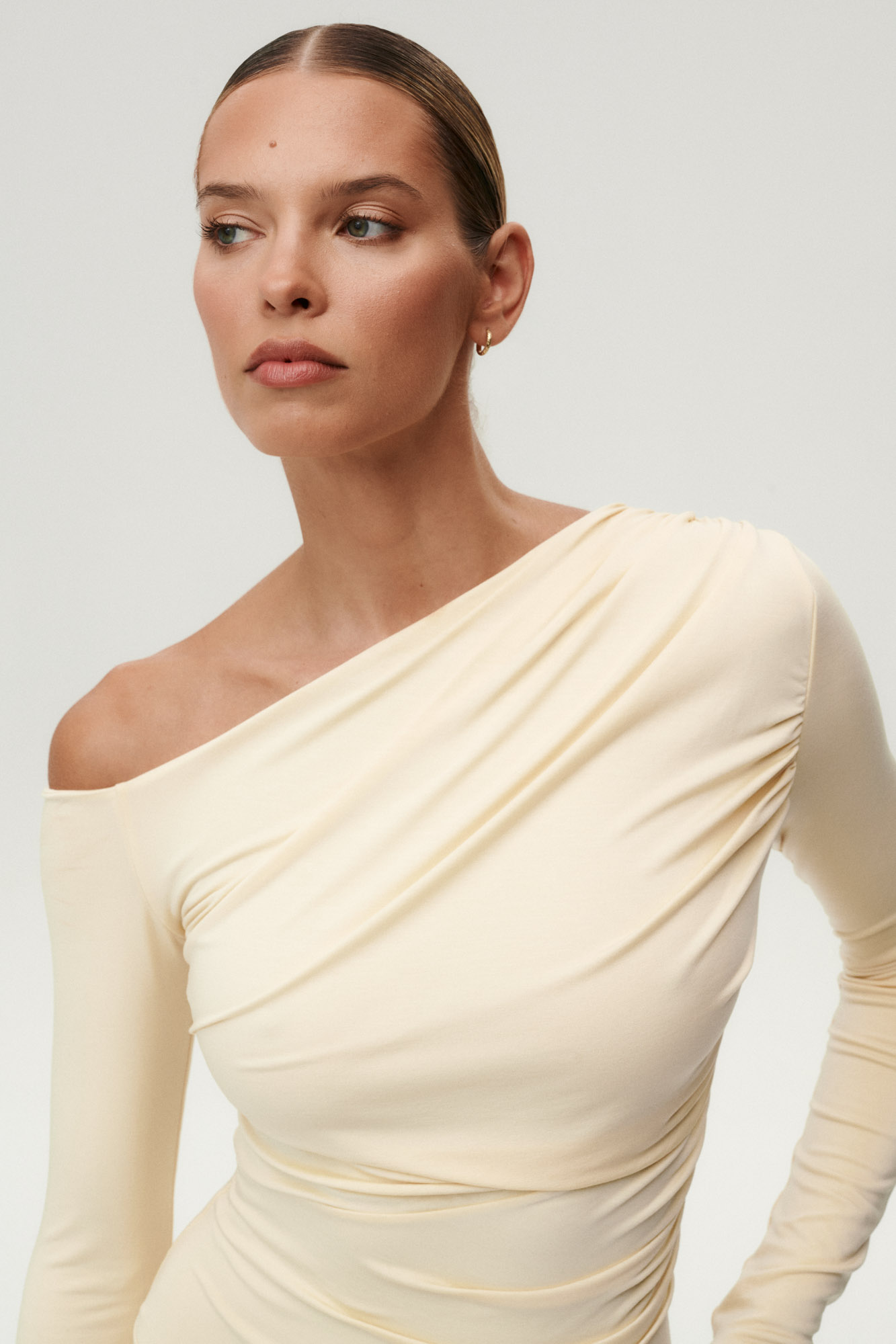 Soft front draping and generous ruching create a naturally sculpted silhouette, adding subtle movement and depth.
